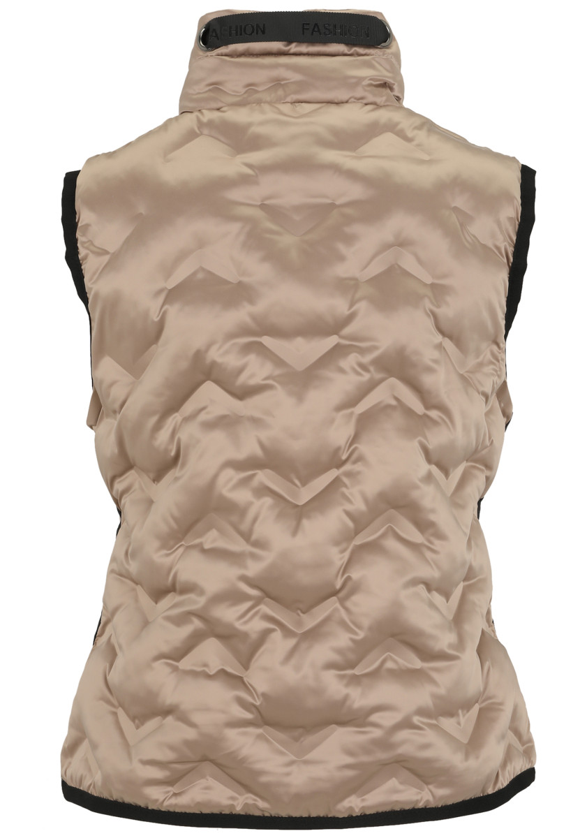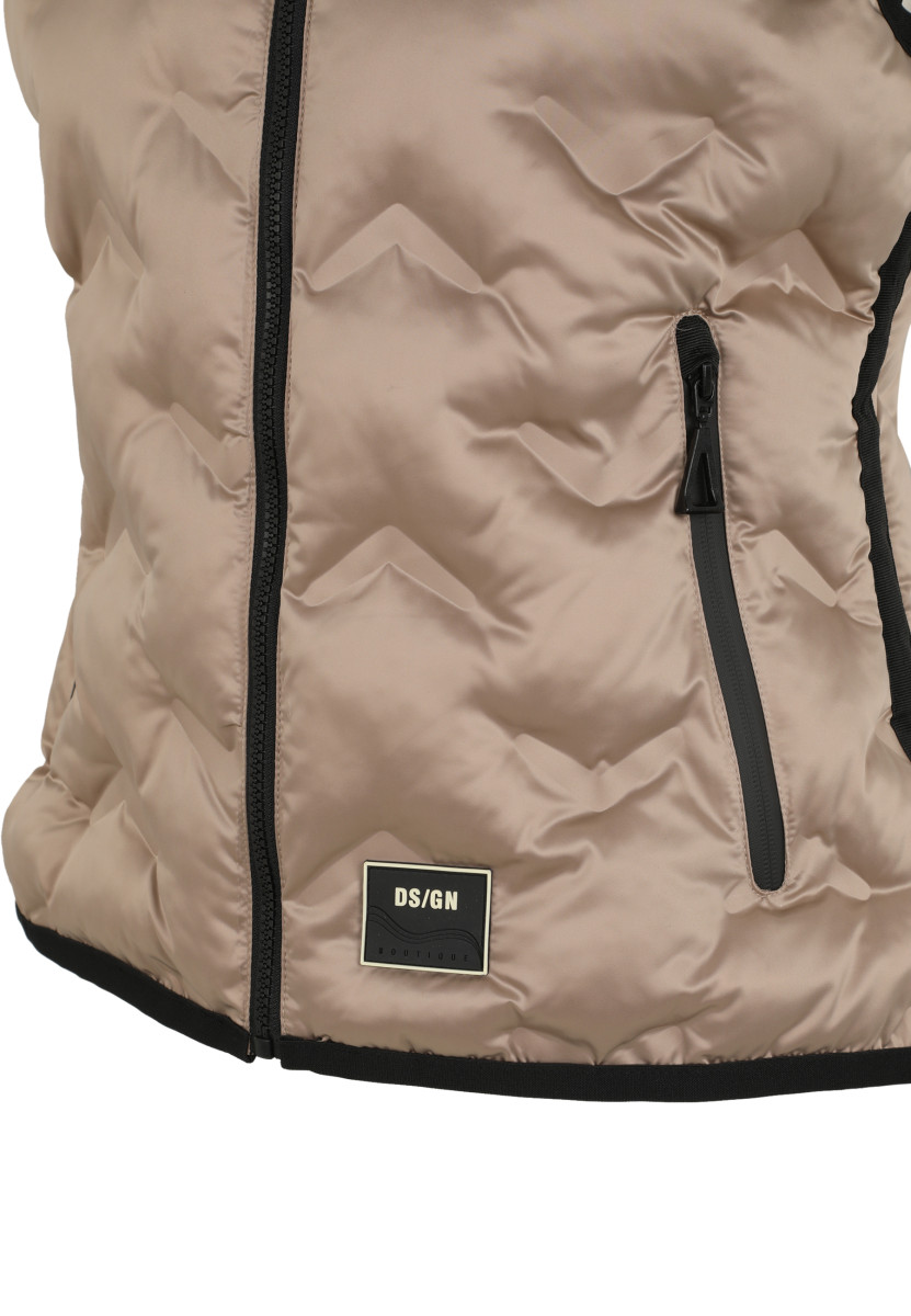 Dünn wattierte ärmellose Weste von Doris Streich aus softer Nylon-Ware mit sog. Ball-Stuffing gefertigt. Die Weste mit Ihrem dekoratives Allover 3D-Prägemuster wird komplettiert durch den Reissverschluss mit dekorativem Anhänger, Bändern mit 3D-Prägung, zwei Zipper-Taschen und einem Badge. Der Kragen kann locker legère aufgestellt oder umgeschlagen werden.