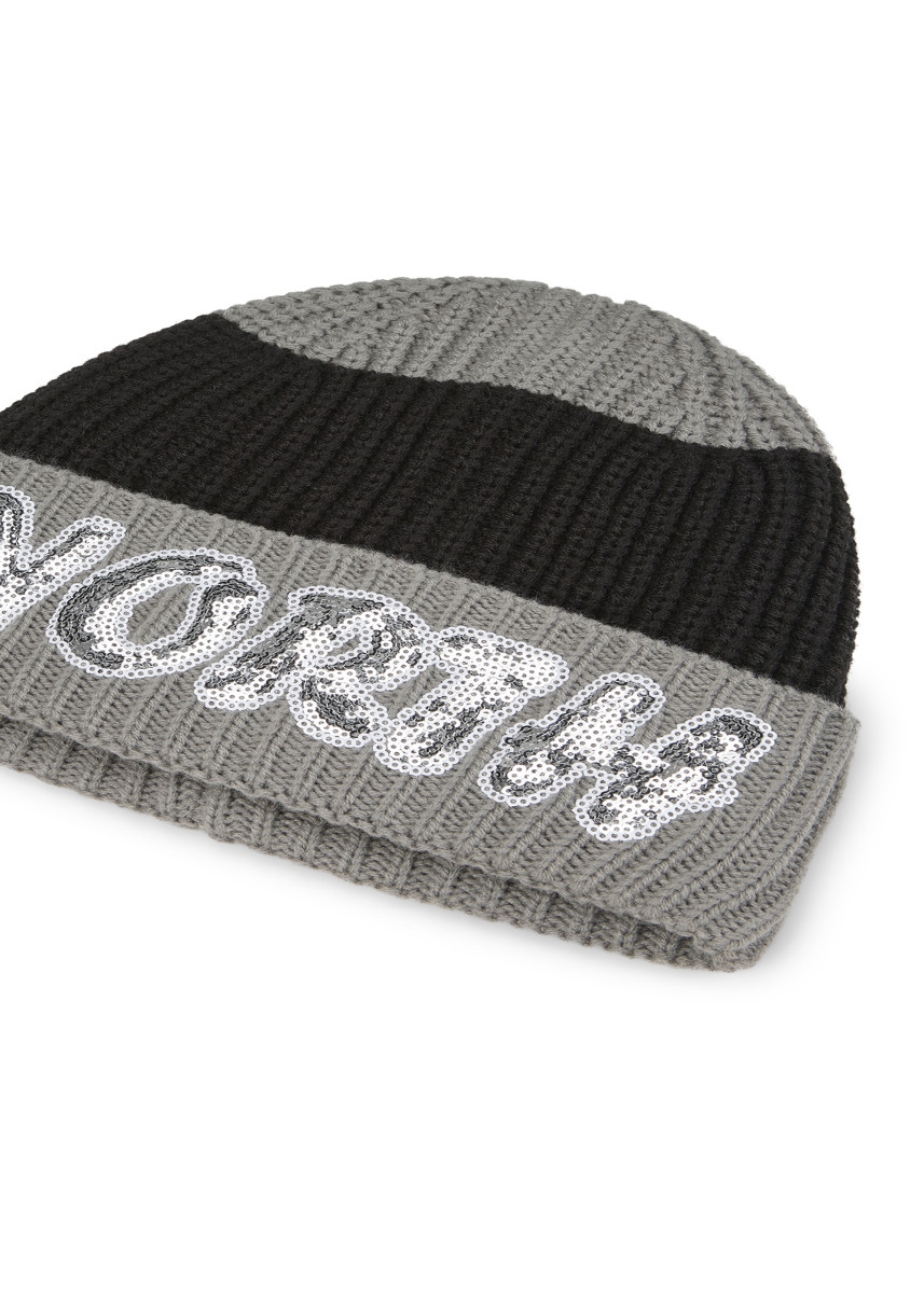 Setze ein Statement mit dieser trendigen Strickmütze in Grau und Schwarz! Die zweifarbige Mütze kombiniert Komfort mit einem coolen Design und dem auffälligen Schriftzug „NORTH“ aus glitzernden Pailletten. Perfekt für kalte Tage, wenn du nicht nur warm bleiben, sondern auch modisch auffallen möchtest.