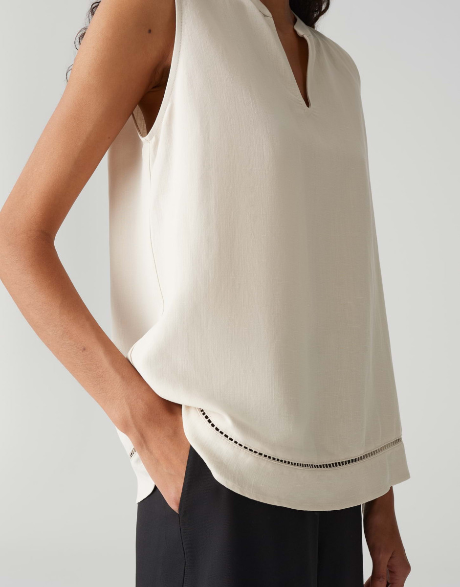 Lockere Passform | Leicht ausgestellt geschnitten | Normale Länge | Ärmellos | Rundhals mit V-Ausschnitt | Rückenlänge ca. 60 cm bei Größe 36 | Model Größe 175 cm – trägt Größe 36 | Webware | Natürliche Leinenstruktur | Natürlicher Griff | Atmungsaktiv | Kühlender Effekt | Teilungsnaht im Rücken.
