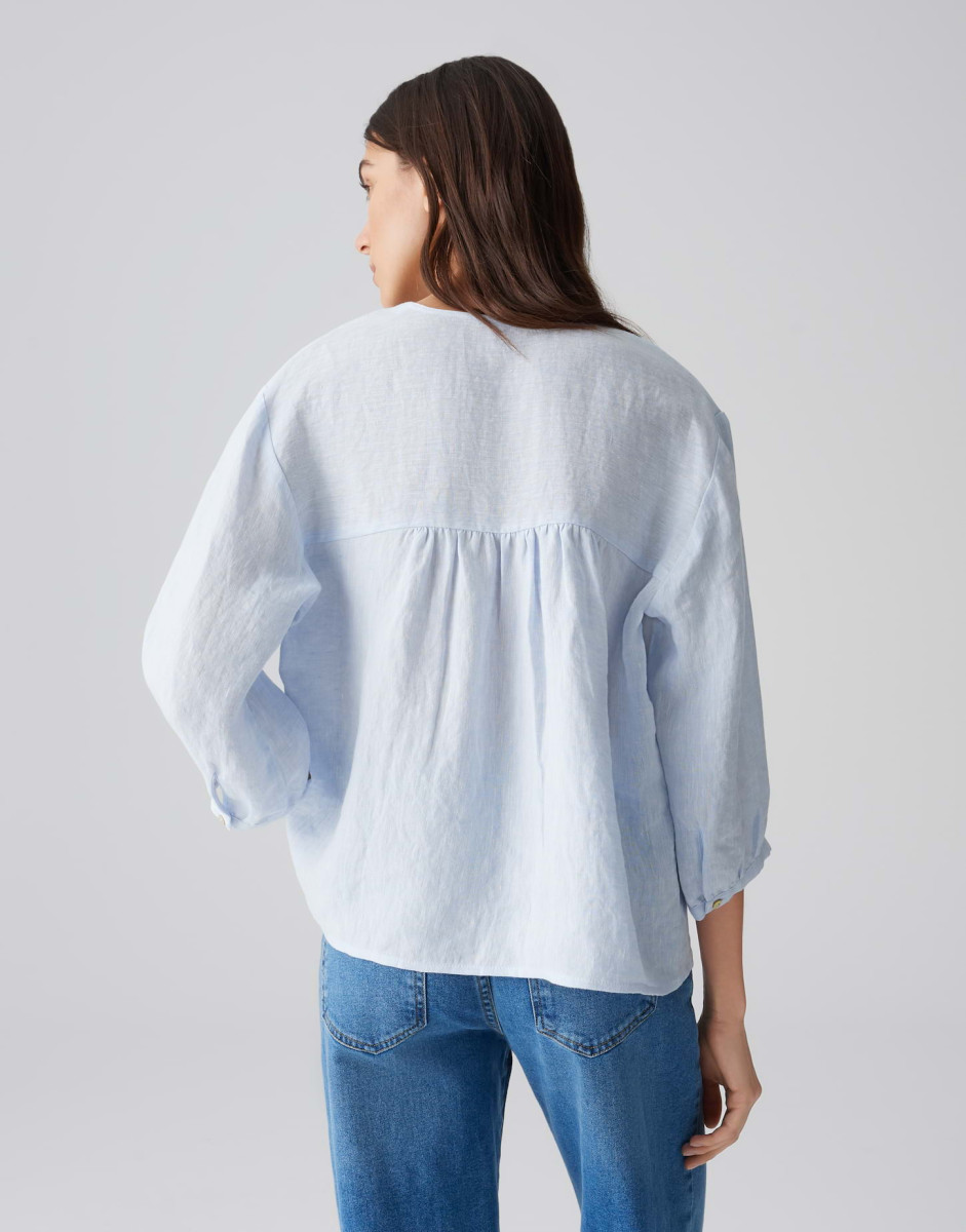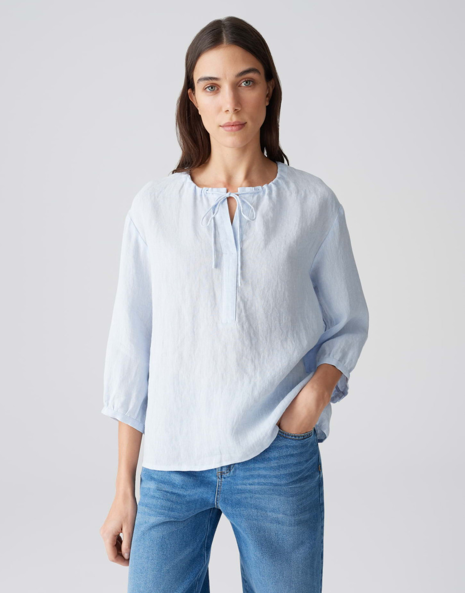 Weite Passform | Boxy Silhouette | Verkürzte Länge | Überschnittene Schulter Mit 3/4 Arm | Rundhals Mit V-Ausschnitt | Rückenlänge Ca. 62 Cm Bei Größe 36 | Model Größe 178 Cm – Trägt Größe 36 | Webware | Natürliche Leinenstruktur | Natürlicher Griff | Leichte Transparenz | Kühlender Effekt | Atmungsaktiv | Kordel Zum Binden | Passe Mit Raffungen Im Rücken