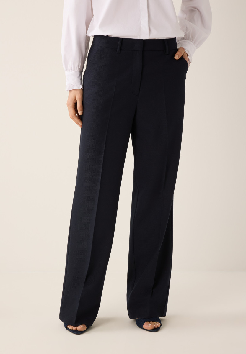 Gerade Form mit weitem Bein und Bügelfalte | Mittlere Leibhöhe | Verdeckter Frontverschluss | Bund mit Gürtelschlaufen | Schräge Eingriffstaschen vorne, Leistentaschen hinten | Oberstoff mit feiner Piqué-Struktu