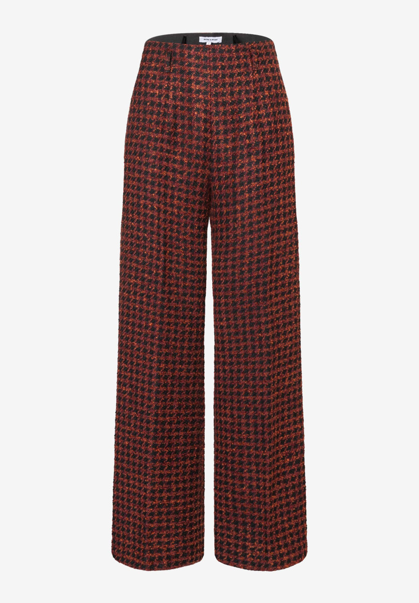 Die weite Bouclé-Hose von MORE & MORE mit klassischem Hahnentritt Dessin in schwarz mit nougatbraun ist ein vielseitiges Keypiece für elegante und zugleich entspannte Looks. Die stylishe Silhouette sorgt für moderne Lässigkeit während das markante Muster einen stilvollen Akzent setzt.