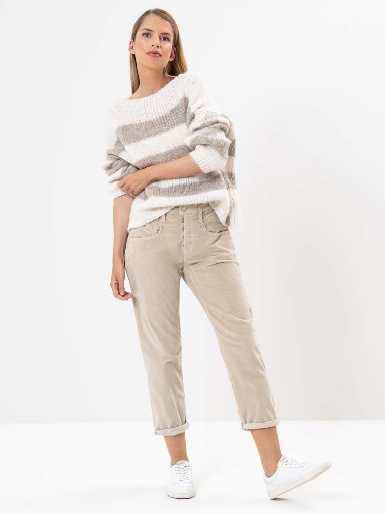 Das Shyra Tap Modell kommt als Cordhose gerade recht zur kalten Jaherszeit. Der beliebte Shyra Schnitt mit halb verdeckter Knopfleiste und stylischem Boyfriend Fit hat in dieser Version ein Plus an Beinweite. Die Passform wird so bestechend lässig und noch Herrlicher.