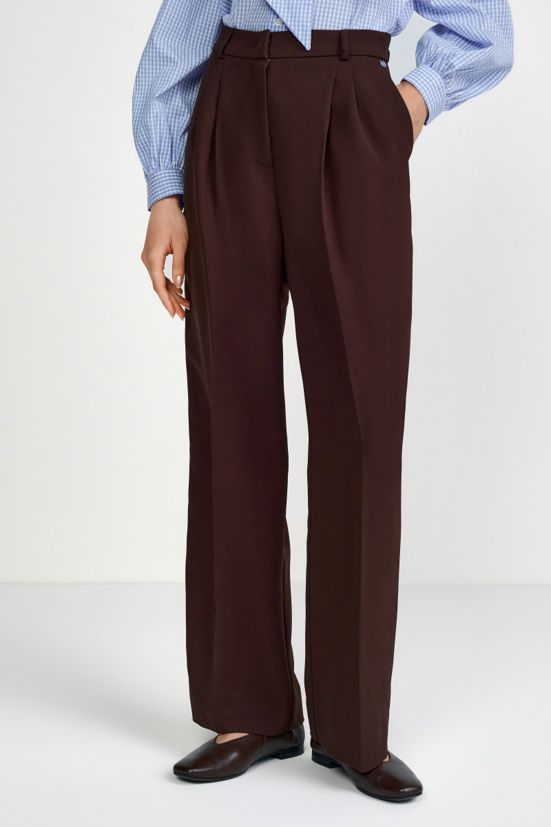 Diese stilvolle Bundfaltenhose in Dunkelbraun ist ein zeitloses Must-have für Ihre Garderobe. Der moderne, verkürzte Schnitt im Culotte-Stil sorgt für eine lässige Eleganz, während die Bundfalten auf der Vorderseite dem Design eine raffinierte Struktur und fließende Bewegung verleihen.