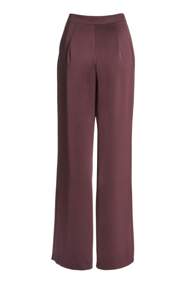 Diese elegante Anzughose präsentiert sich in einer zeitlosen Silhouette mit einem modernen Touch. Gefertigt aus einem fließenden, möglicherweise leicht glänzenden Material, bietet sie einen hohen Tragekomfort und einen geschmeidigen Fall. Der Schnitt ist gerade und leicht ausgestellt, was eine optisch streckende Wirkung erzielt. Sie ist hoch geschnitten und verfügt über einen glatten Bund mit einem einzelnen sichtbaren Knopfverschluss sowie einem verdeckten Reißverschluss, der für eine nahtlose, klare Optik sorgt. Die Hose ist vielseitig einsetzbar und eignet sich perfekt für das Büro, formelle Anlässe oder als stilvolle Basis für einen eleganten Alltags-Look. Sie lässt sich hervorragend mit taillierten Blazern oder fließenden Oberteilen kombinieren.