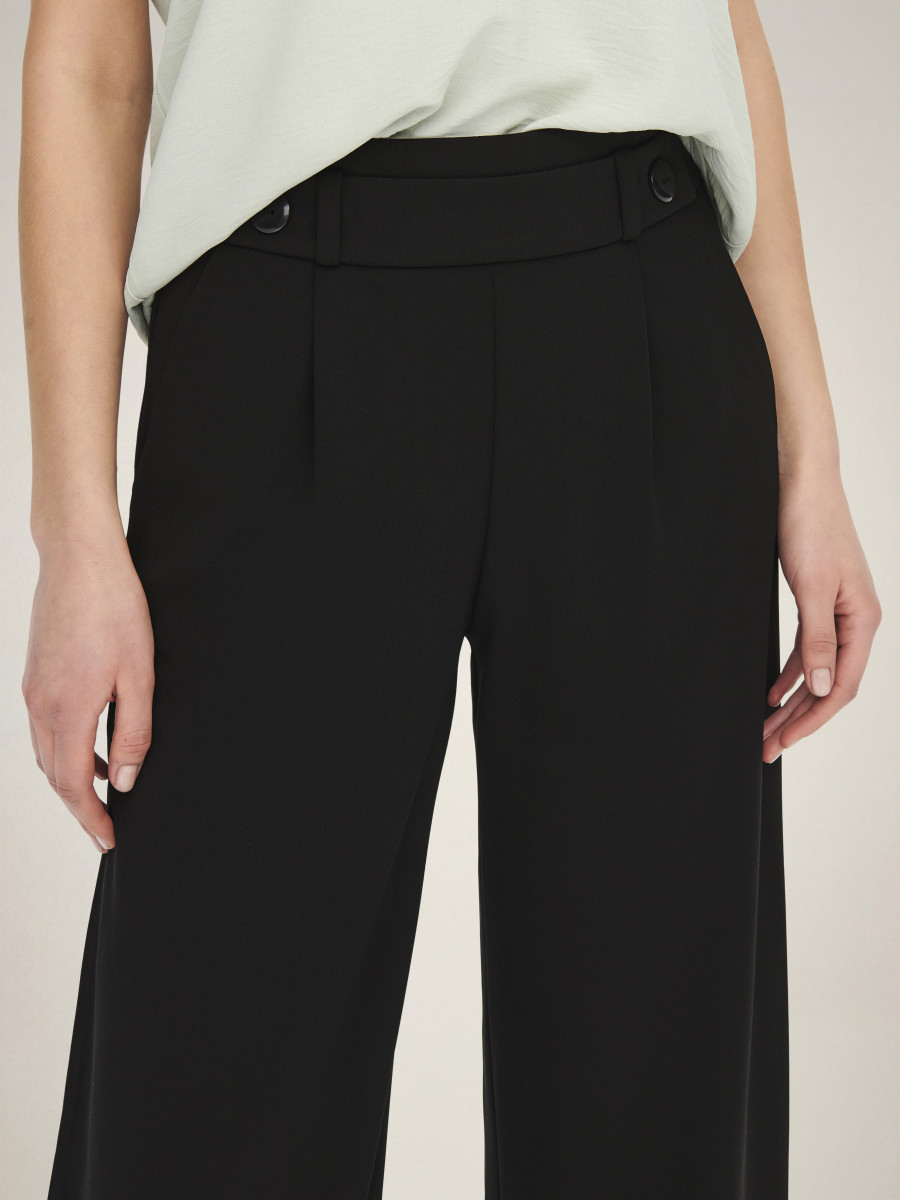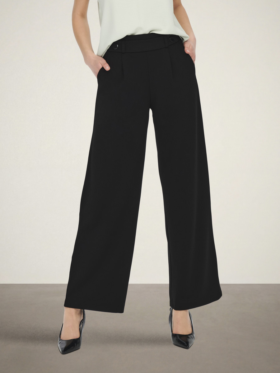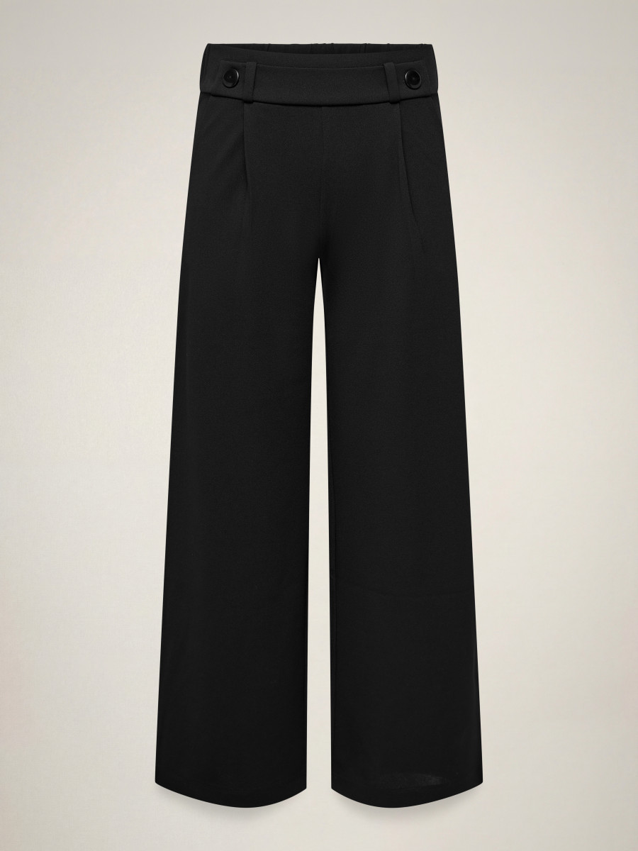 Finde die perfekte Hose und kombiniere sie im Alltag mit einer schlichten Bluse und Sneakern oder style sie abends mit einem festlichen Oberteil und High Heels.Jersey ist ein weiches, dehnbares Material, das für maximalen Komfort sorgt.JDY ist ein internationales Modelabel, das modebewussten Frauen eine vollständige Palette an bezahlbaren und trendigen Produkten bietet. - Produkttyp : Hose mit weitem Beinschnitt - Taschen : Vordertaschen - Länge/Größe : Lang - Details : Elastischer Bund im Rücken, Knopf-Details - Passform : Weiter Beinschnitt