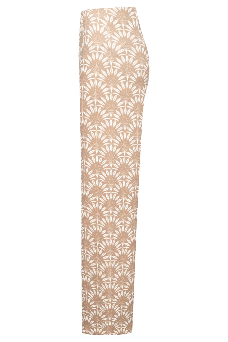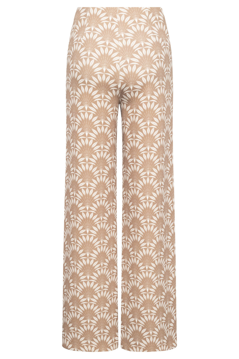 Modell: Pull-on style Hohe Leibhöhe Weites Bein Leistentaschen hinten Artikel: Bi-elastischer Scuba-Stoff mit weichem Griff Grafisches Fächer- und Palmenmotiv Glatte, kompakte Oberfläche mit leichtem Stand Formstabil Fußweite: 58 cm Schrittlänge: 80 cm