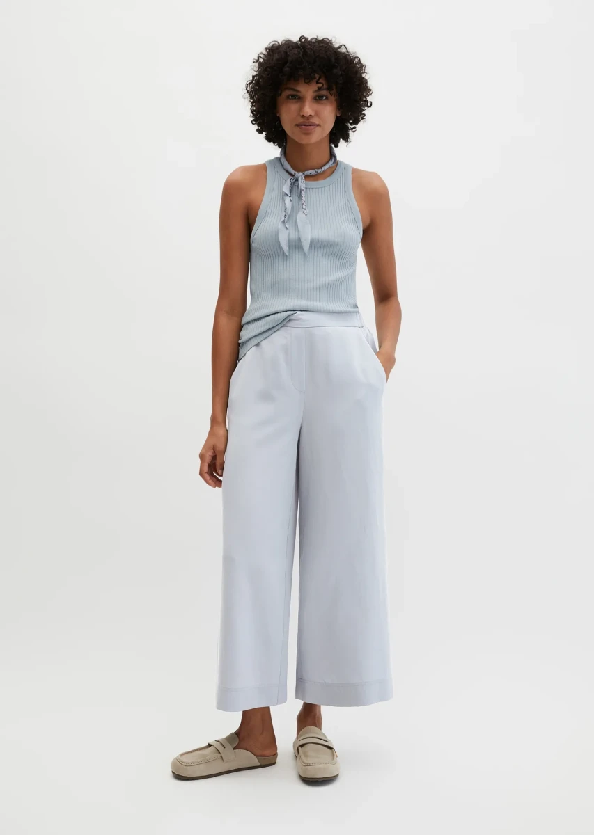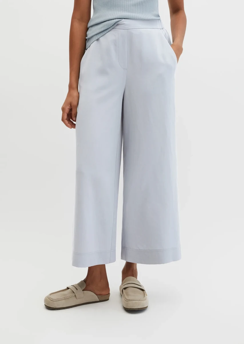 Die Hose Model Margo wide ist Teil einer Kollektion aus charakterstarken Fits, die zeitloses Design und langlebige Qualität mit besonderem Tragekomfort verbinden. Passformen, die jede Saison funktionieren - verlässlich, klar, durchdacht - gefertigt aus Premium-Materialien und mit einem Auge für besondere Details. Die Hose hat einen modernen, weiten Schnitt mit normaler Leibhöhe und lässig verkürzten Beinen im Culotte-Stil. Sie setzt Taille und Beine gekonnt in Szene und ist damit die perfekte Alternative zur klassischen Stoffhose. Sie verfügt über eine teil-elastische Bundverarbeitung, schräge Eingrifftaschen vorne und eine schmale Paspeltasche auf dem Gesäß. Das Material ist ein weicher Mix aus Lyocell und Leinen.