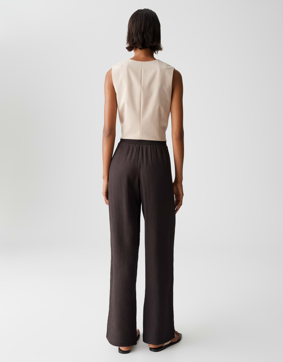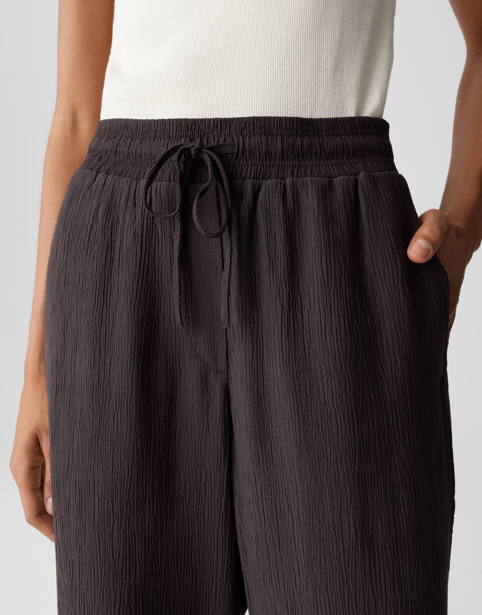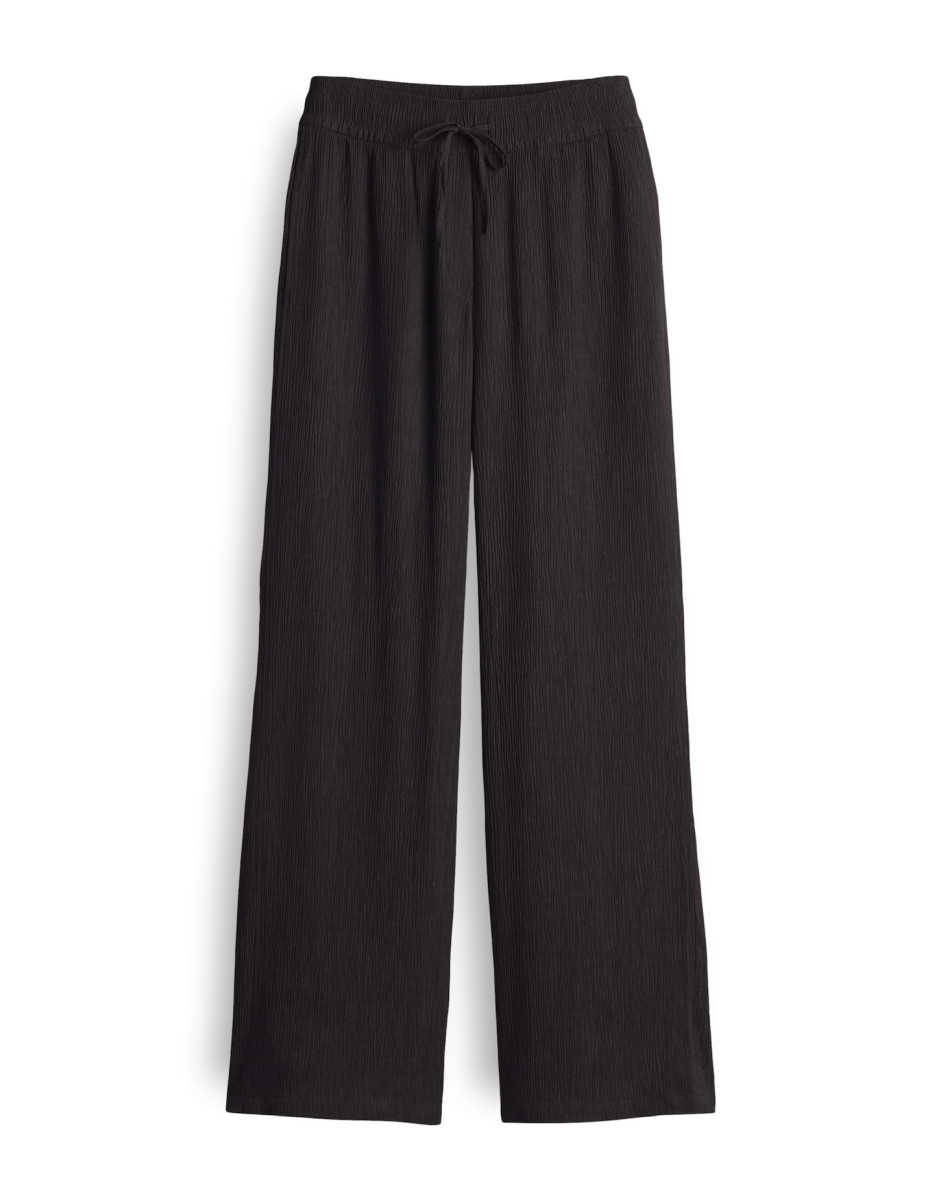 Weiter | gerader Beinverlauf | Hosenbein-Innenlänge ca. 81 cm in jeder Größe | Model ist 175 cm groß und trägt Größe 36 | Webware mit Crinkle-Effekt | Natürlicher Griff | Elastischer Stoff mit fließendem Fall | Französische Eingrifftaschen | Elastischer Gummibund | Kordel zum Binden