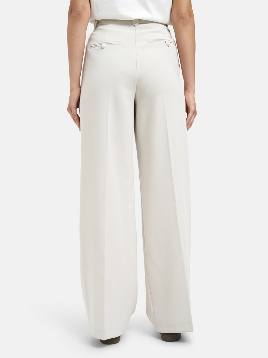 Diese Damenhose verbindet klassische Eleganz mit modernem Komfort. Der weite, gerade Schnitt und die gepflegte Bundfalten-Optik verleihen der Hose eine stilvolle, zeitlose Ausstrahlung. Der helle Beigeton ist vielseitig und lässt sich perfekt in jede Garderobe integrieren, ob für den Büro-Look oder entspannte Freizeit-Outfits.