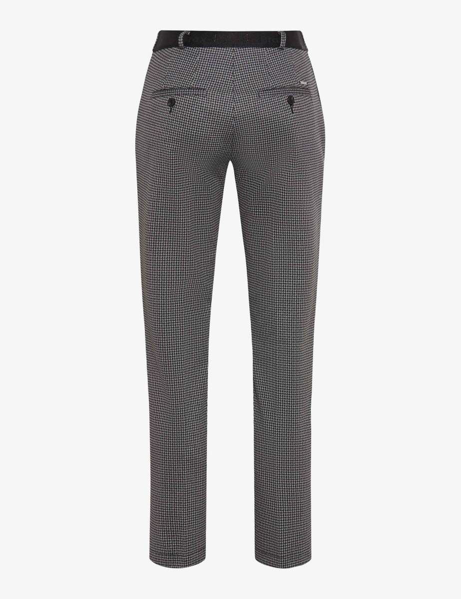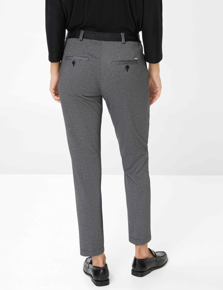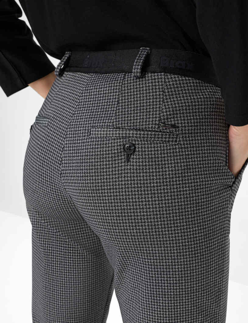 Ein minimalistisches Muster mit maximaler Wirkung: Die Chino im Style MARON S begeistert modebewusste Frauen, die einen stilvollen Look mit hohem Komfort verbinden möchten. Durch die verkürzte 7/8-Länge erhält die klassische Silhouette eine moderne Note, die eine konisch zulaufende Form im Regular Fit mit einer femininen, niedrigen Leibhöhe kombiniert. Ergänzt durch einen elastischen Pull On-Dehnbund, der zusätzlichen Tragekomfort bei dieser smarten Damenhose bietet. Ein eleganter Bügelbruch unterstreicht die klare Linienführung, französische Taschen und schmale Leistentaschen runden das Design geschmackvoll ab. Der fein gezeichnete Hahnentritt in gedämpften Grautönen verleiht dem Look eine subtile Raffinesse, so dass sich die Hose vielseitig kombinieren lässt. Aus formstabilem Jersey gearbeitet, bietet der Polyester-Mix mit Viskose und Elasthan eine angenehm weiche Haptik, Formstabilität und optimale Bewegungsfreiheit – perfekt für Herbst-Winter-Outfits mit trendsicherem Charakter.