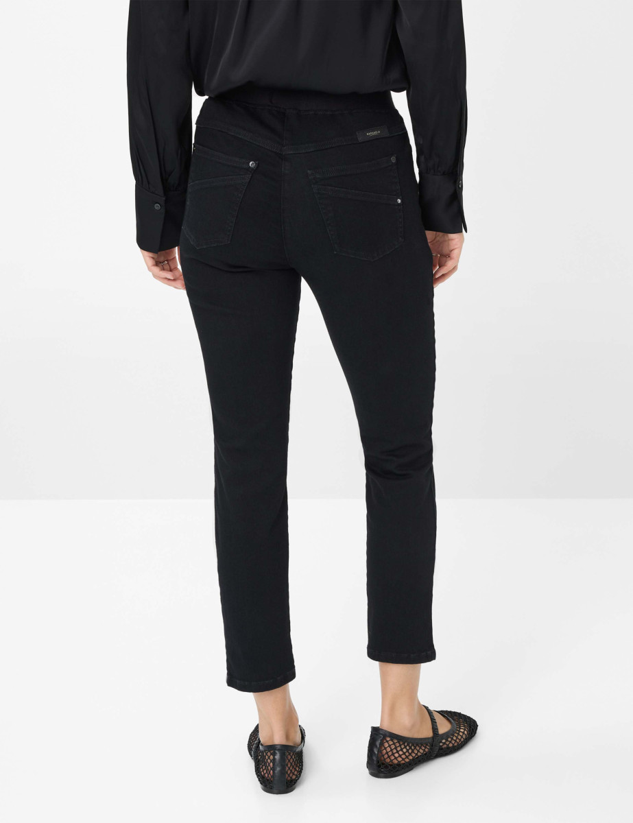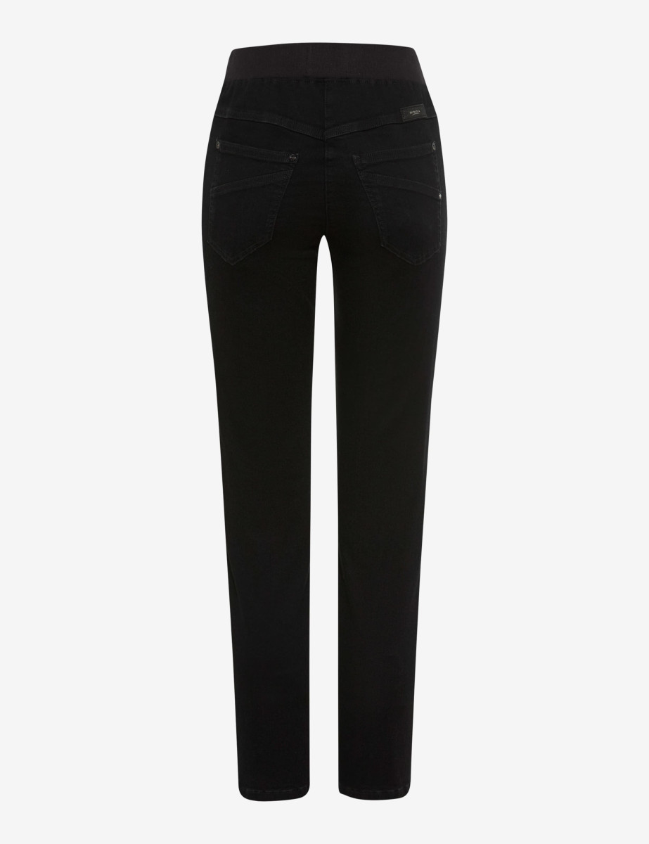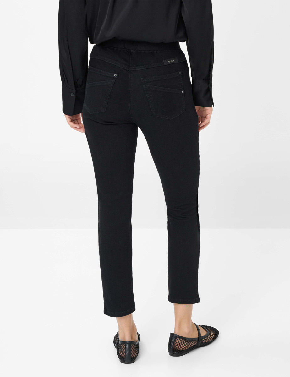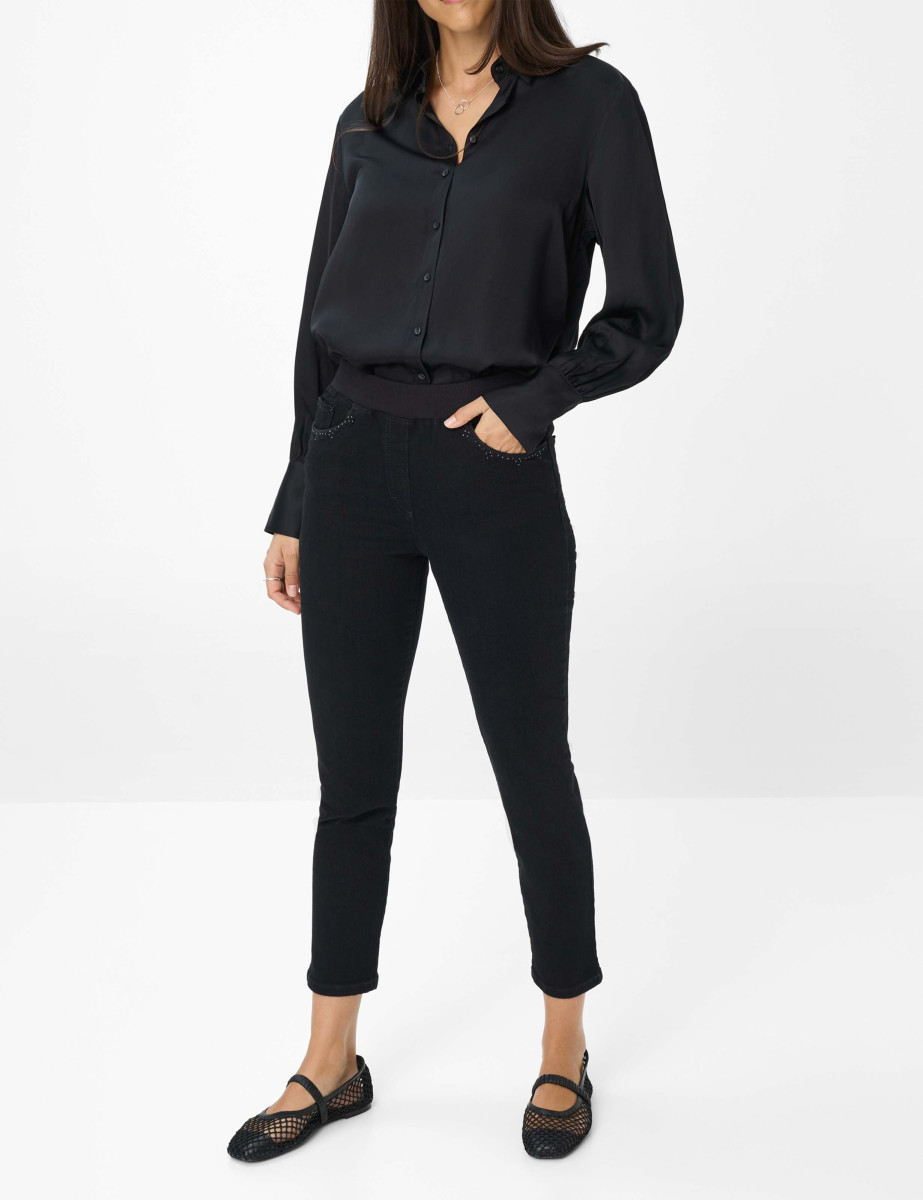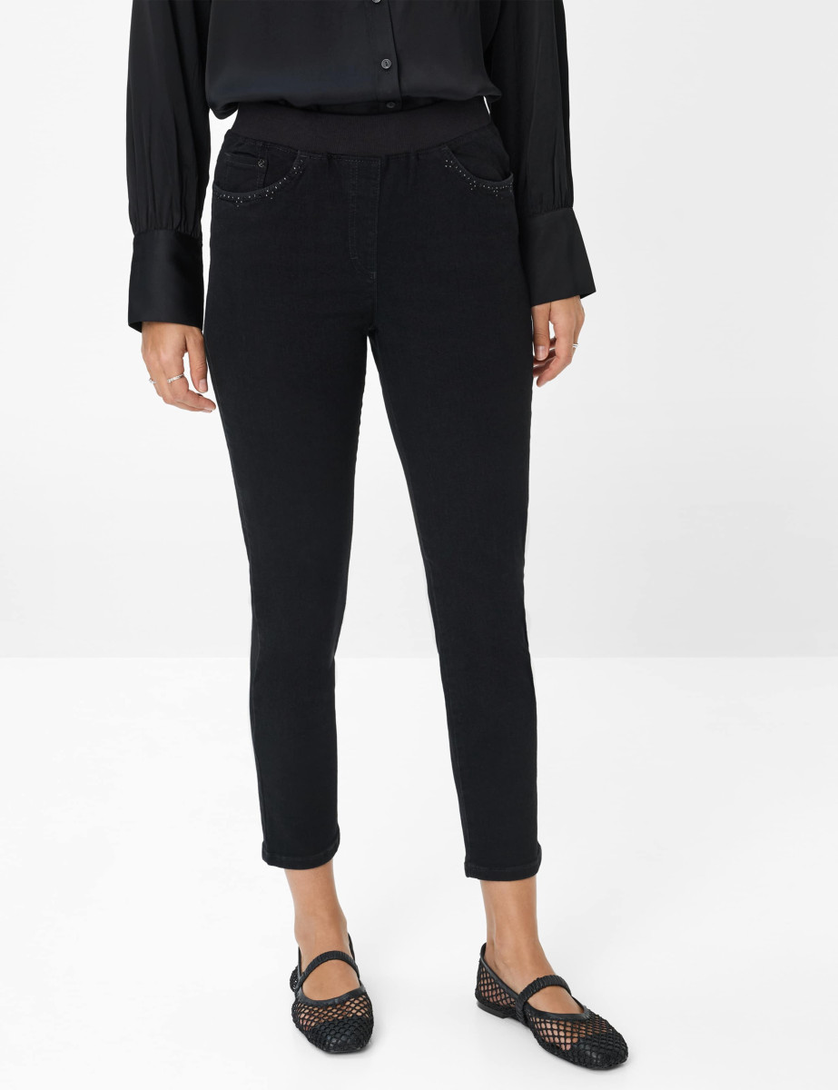Diese schwarze Damenhose vereint modernen Stil und hohen Komfort. Der elastische Bund sorgt für eine bequeme Passform, während das dezente Strass-Dekor an den Taschen der Hose für einen eleganten und glanzvollen Akzent sorgt. Ein echtes Must-have für jede Garderobe!