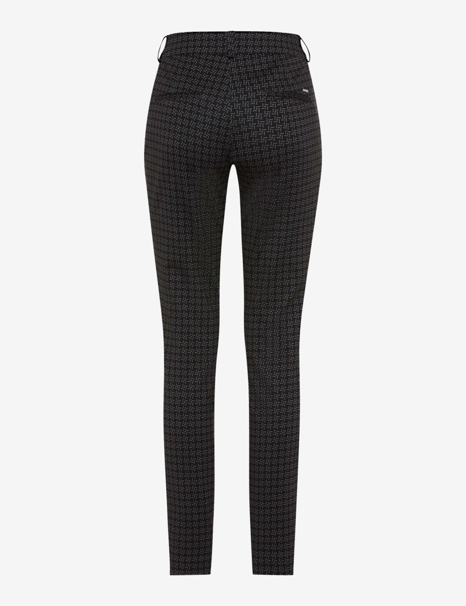 Diese moderne Damenhose überzeugt durch eine schmale Passform, die das Bein elegant betont und eine zeitgemäße Silhouette schafft. Das Material ist mit einem dezenten, grafischen Mikro-Muster versehen, das dem Look eine subtile Tiefe und Textur verleiht.