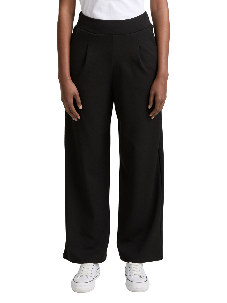 Stoffhose mit elastischem Bund, seitlichen Eingriffstaschen und Falten-Details auf der Vorderseite. Aus einem strukturierten Krepp-Material.