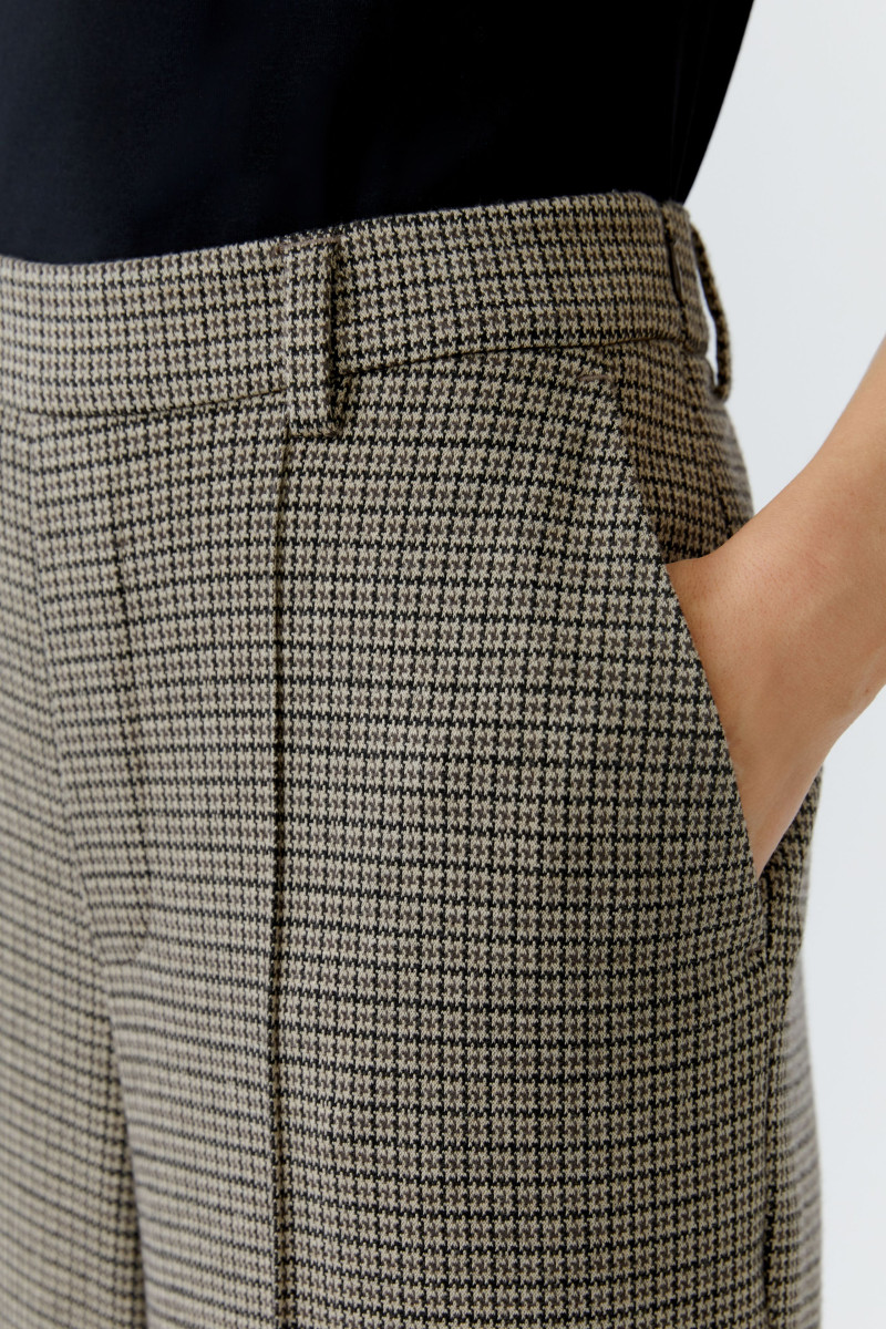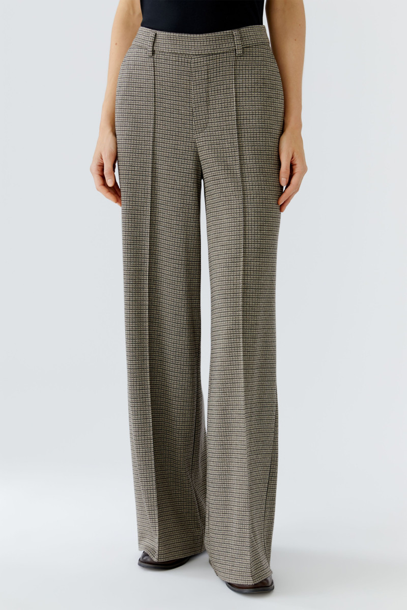 Bequemer Jersey mit Viskose im Hahnentritt-Muster | Gerade geschnitten, reguläre Länge | Bequemer Bund, hinten mit Gummi, vorne glatt, seitlicher Reißverschluss | Seitliche Eingrifftaschen, angedeutete Gesäßtaschen | Vorne fest fixierte Biese als Bügelfalte