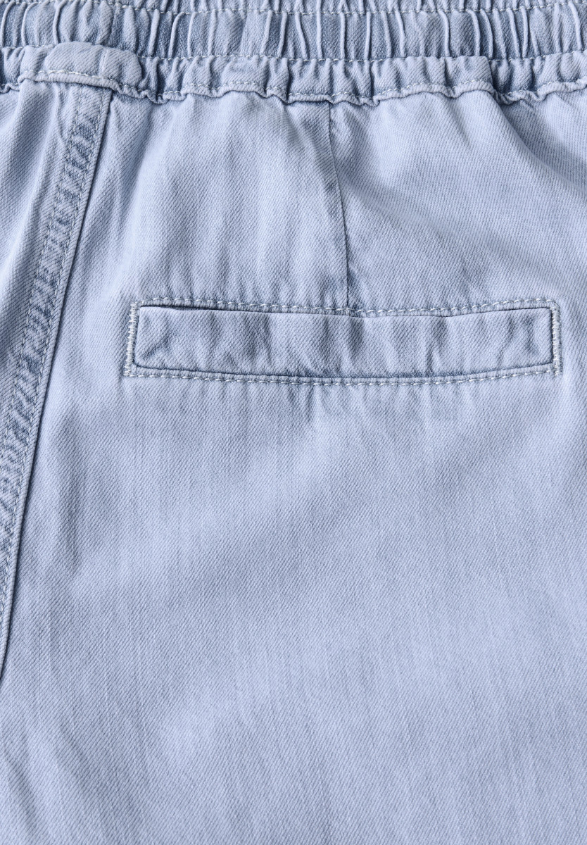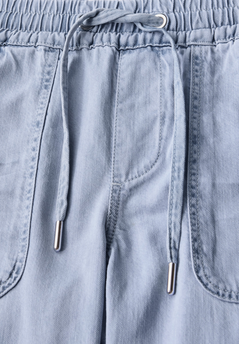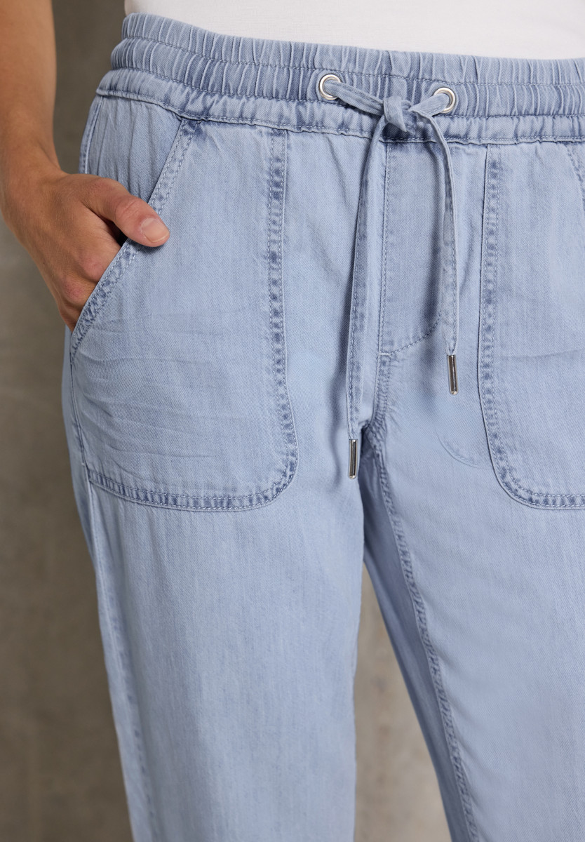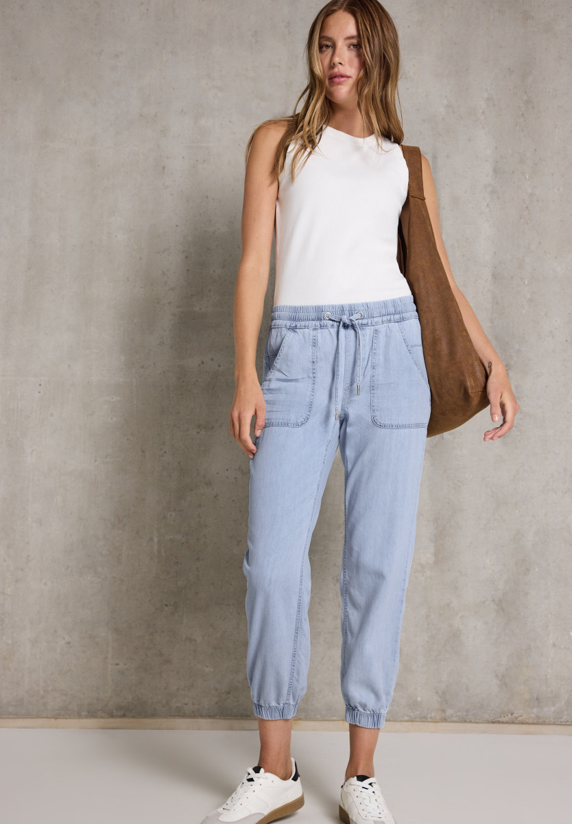 Die Jogg-Jeans überzeugt im Casual Fit mit Mid Waist und schmal zulaufenden Tapered Legs. Elastische Bündchen an den Beinsäumen, ein elastischer Bund mit Tunnelzug und seitliche Taschen sorgen für sportliche Lässigkeit und guten Sitz. Der weiche Lyocell-Mix macht die Hose besonders bequem und eignet sich ideal für entspannte Alltagslooks.Lief.-Art-Nr: F379559