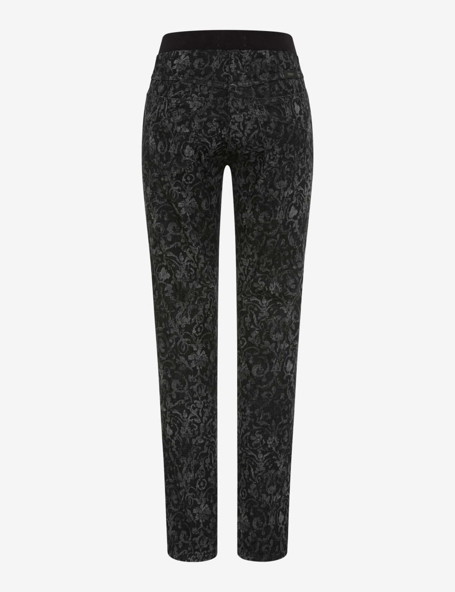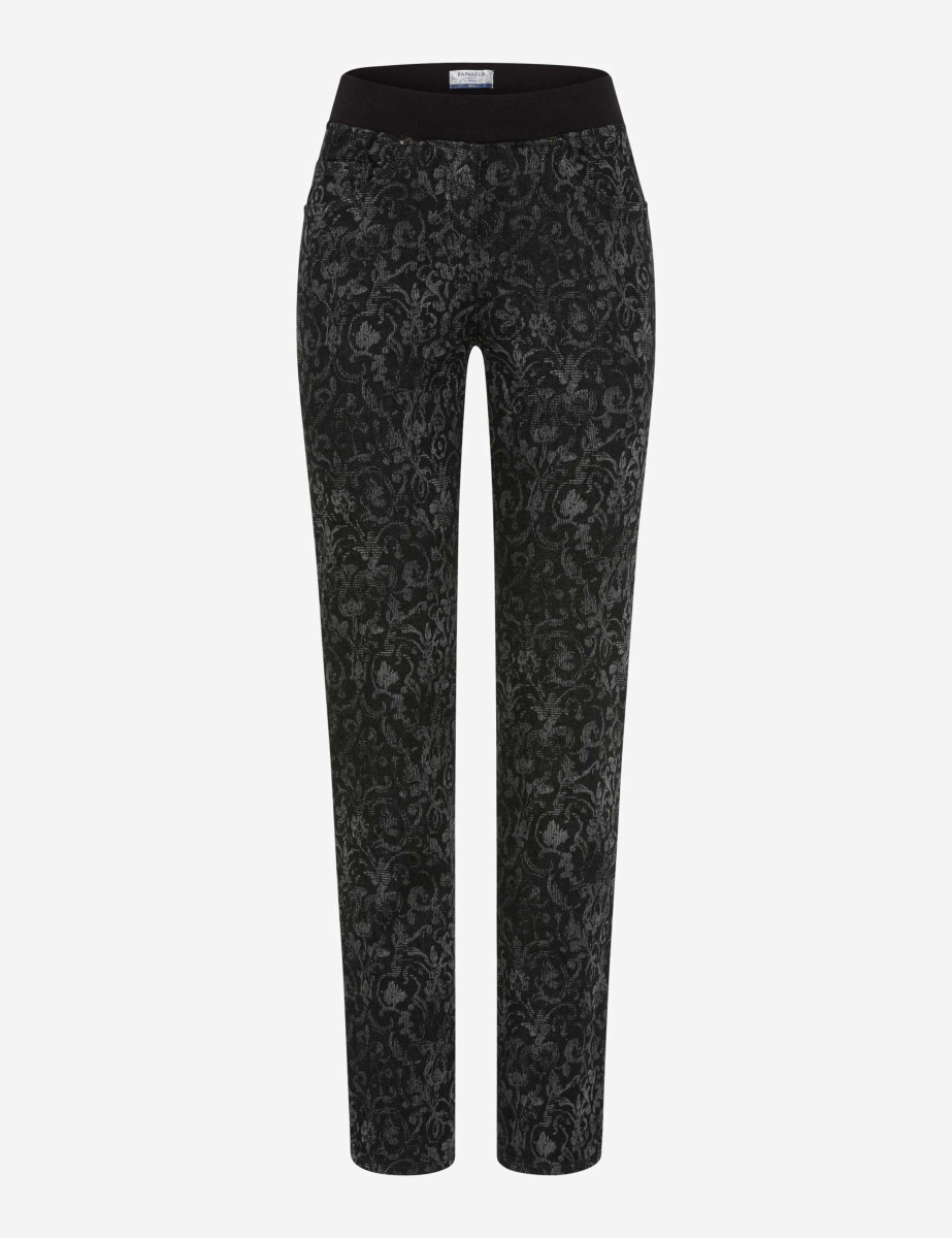 Stilvoll, bequem und mit besonderem Charme – die Schlupfhose im Style PAMINA verbindet modisches Feingefühl mit maximalem Tragekomfort. Die schmale Passform mit hoher Leibhöhe formt eine feminine Silhouette, während der elastische Bund das Anziehen besonders unkompliziert macht. Aufgesetzte Gesäßtaschen setzen dezente Akzent und der edle Ornament-Print verleiht der Hose eine elegante Note mit individuellem Charakter – perfekt für moderne Looks mit dem gewissen Etwas. Gefertigt aus elastischem Denim im Baumwollmix mit Polyester und Elasthan bietet die Jeanshose ein angenehmes Hautgefühl, zuverlässige Formstabilität und angenehme Bewegungsfreiheit. Der hochwertige Denim sorgt für einen authentischen Look mit weichem Griff, während Elasthan und Polyester für Flexibilität und Strapazierfähigkeit sorgen.