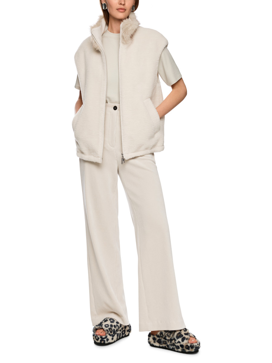 Diese kuschelige Weste mit langhaarigem Fake Fur Kragen sorgt für stilvolle Wärme an kalten Tagen. Der Kragen ist innen weich gefüttert mit Wolle. Überschnittene Schultern und praktische Eingrifftaschen runden das Design ab. Der Zwei-Wege-Reißverschluss sorgt für Flexibilität. Ideal für den modernen Layer-Look.