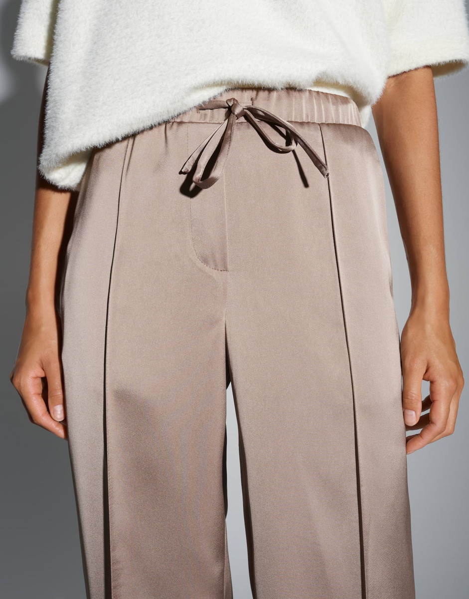 Wide-Fit | Mittlere Bundhöhe | Satin | Glatter Griff | Schimmernde Oberfläche | Fließender Fall | Französische Eingrifftaschen | Zier-Paspeltaschen hinten | Abgesteppte Biese | Bügelfalten hinten | Kordel zum Binden | Elastischer Gummibund