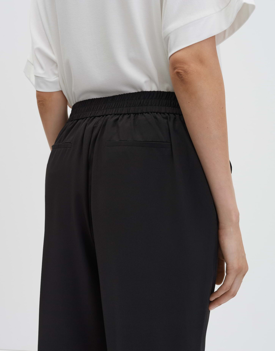 Die Stoffhose wird durch die leichte Ware zu einem unkomplizierten Essential für den Sommer. Für eine sportliche Anmutung sorgen der Gummibund und der abgerundete Saum am Hosenbein.
