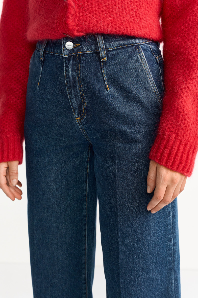 Die Besonderheit liegt in der Wide-Leg Passform mit dem verkürzten Bein (Cropped-Länge), das knapp über dem Knöchel endet und perfekt ist, um Schuhe in Szene zu setzen. Der hohe Bund (High-Waist-Schnitt) betont die Taille vorteilhaft, während die feinen Bundfalten auf der Vorderseite für einen eleganten Fall und eine subtile Fülle sorgen. Der breite, feste Saum mit Umschlag-Optik (oder festem Abschluss) rundet das stilvolle Design ab.