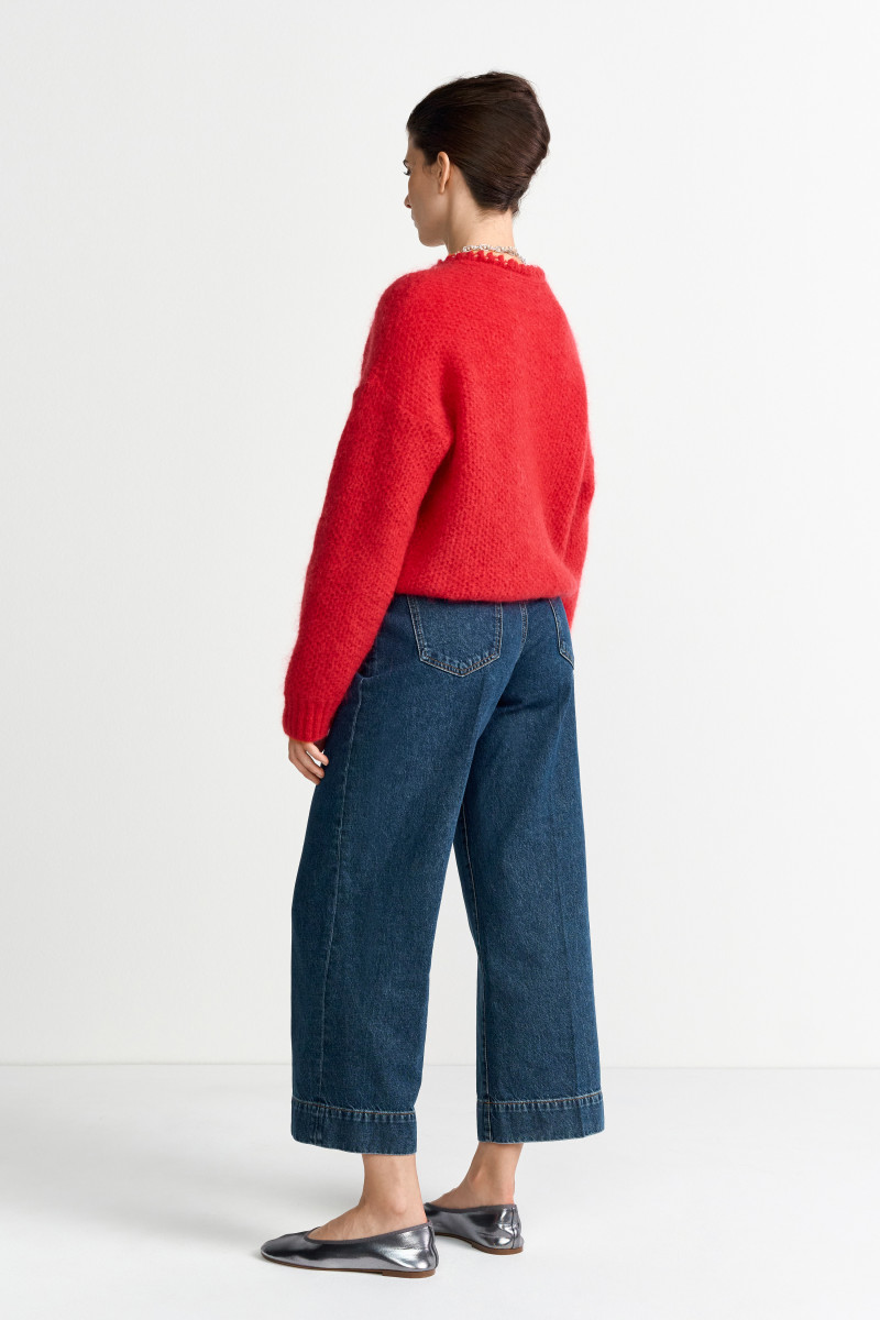 Setzen Sie ein modernes Fashion-Statement mit dieser trendigen Cropped Wide-Leg Jeans. Die Hose vereint den lässigen Charme von Denim mit einer raffinierten, eleganten Silhouette und ist ideal für den Business-Casual-Look und die Freizeit.