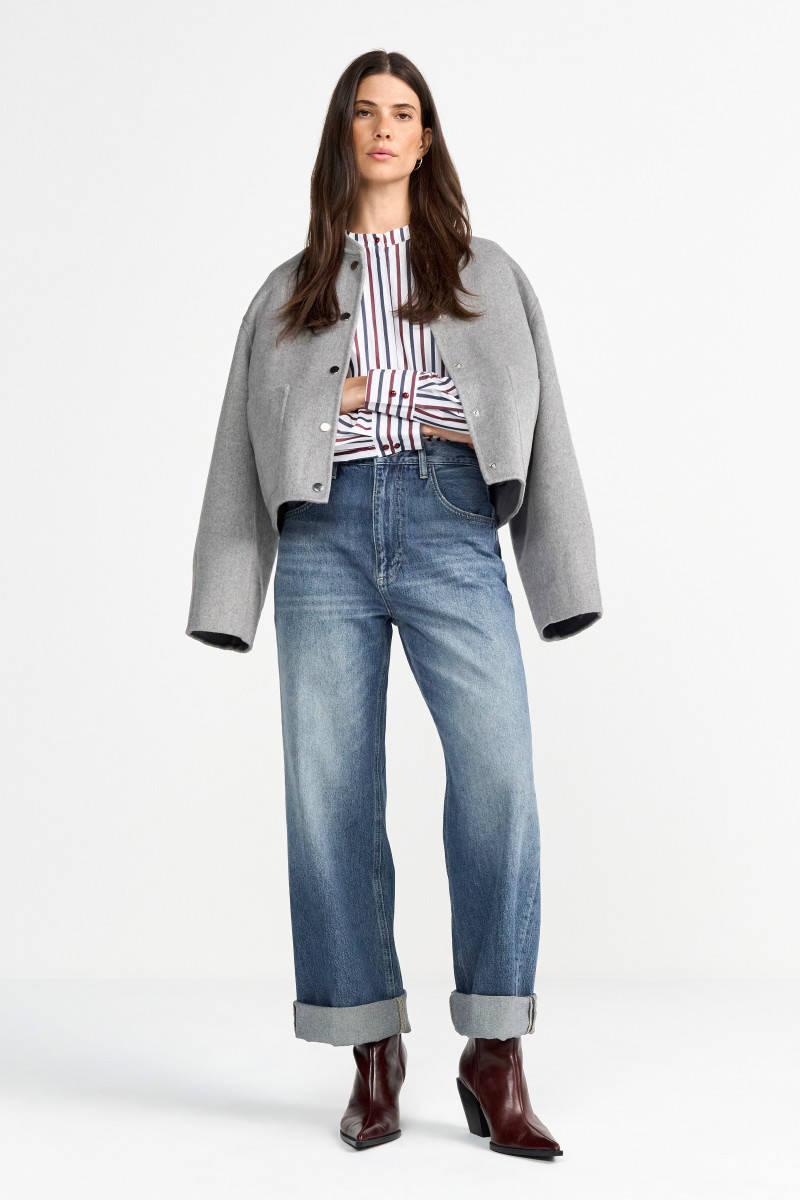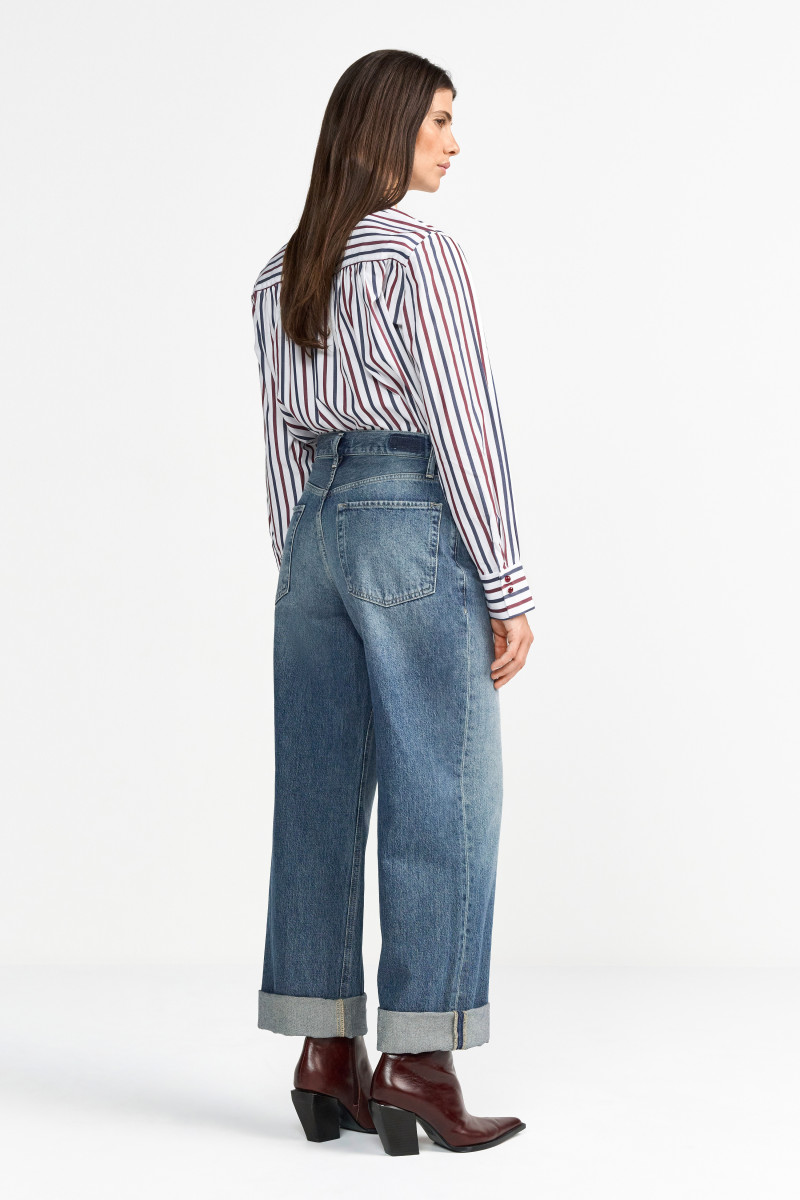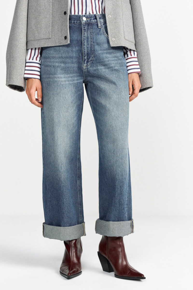 Diese modische Wide Leg Jeans ist ein echtes Fashion-Statement für selbstbewusste Frauen, die Komfort und Stil kombinieren möchten. Der hohe Bund sorgt für eine schmeichelhafte Silhouette, während das weit geschnittene Bein mit lässigem Umschlag modernen Streetstyle-Charme verleiht.