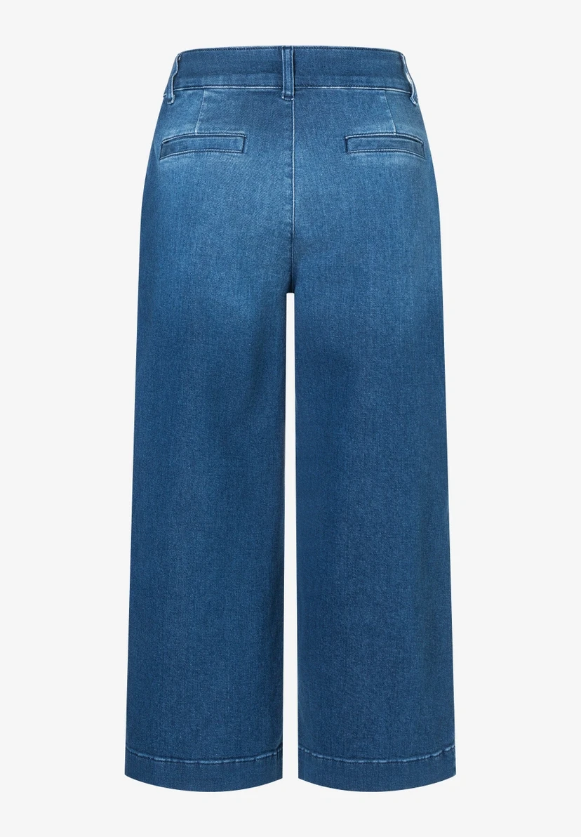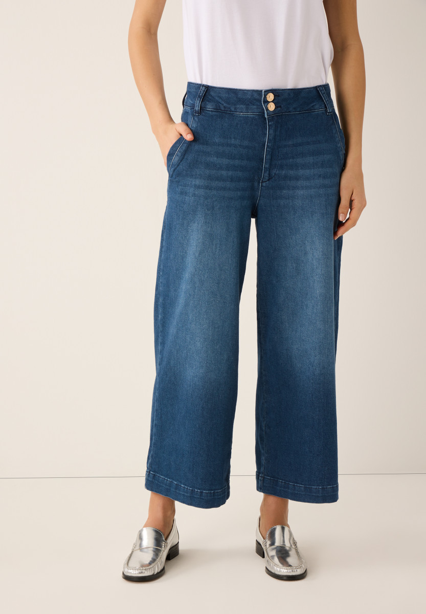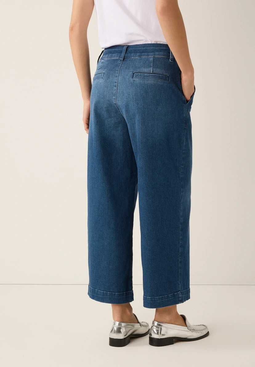 Legere Form mit weitem Bein | Hohe Leibhöhe | Breiter Bund mit Gürtelschlaufen | Verdeckter Reißverschluss | Schräge Eingrifftaschen vorne | Leistentaschen hinten | Waschung mit angedeuteten Sitzfalten