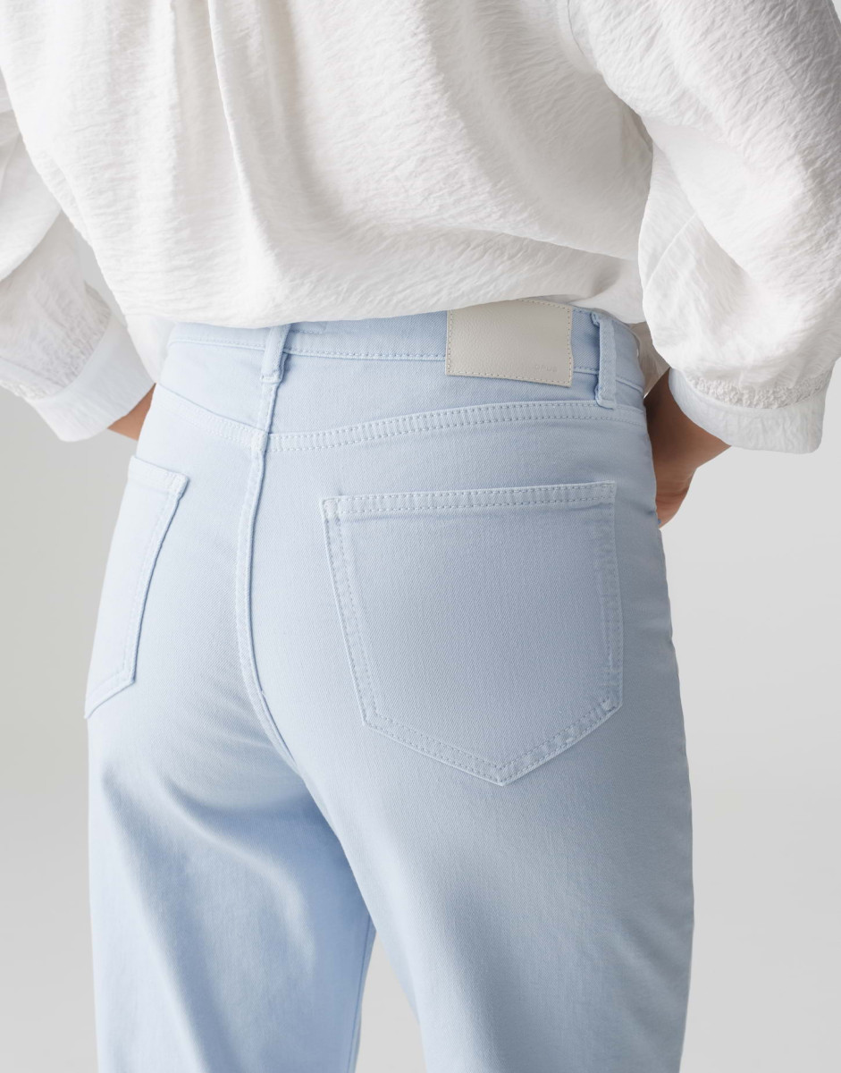 Flared Fit, schmal am Oberschenkel, ausgestelltes Bein, Mid Rise, Ankle, Hosenbein Innenlänge ca. 71 cm in jeder Größe, Model Größe 178 cm – trägt Größe 36, Denim, enthält nichttextile Teile tierischen Ursprungs, weicher Griff, formstabil, Stretchgrad: Comfort, 5-Pocket-Design, Fransenkanten am Saum, Zip-Fly, Crinkle-Effekte, Leder Patch