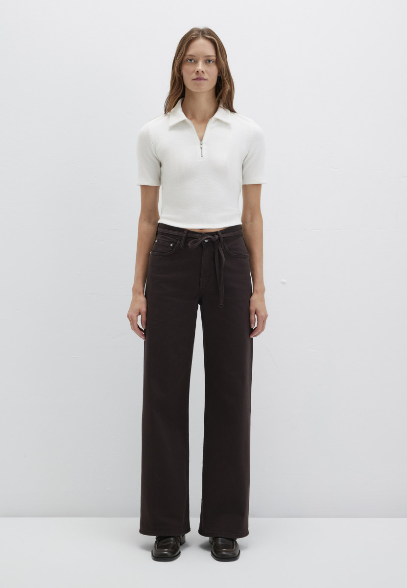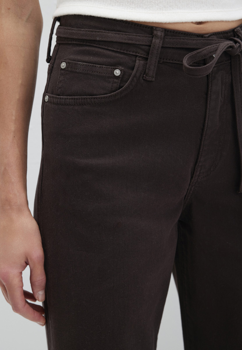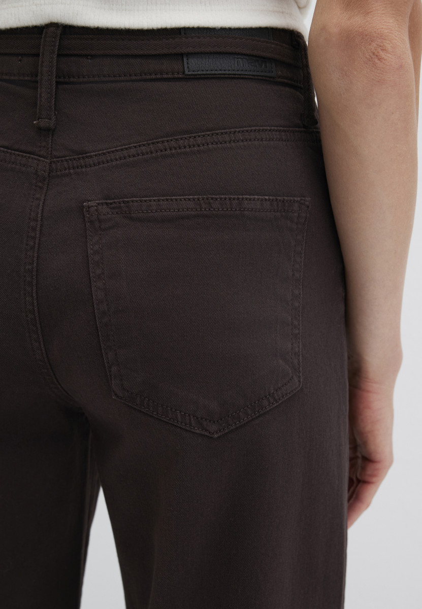 Hoher Bund | Five-Pocket-Style | Reißverschluss mit Bindegürtel | Mittlere Twillqualität mit mittlerem Stretchanteil | Weiter Beinverlauf | Gürtelschlaufen