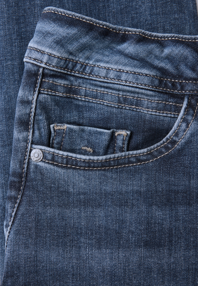 Die Jeans im Style York von Street One für Damen punktet mit einer modernen High Waist und schmalem Beinverlauf. Die dunkelblaue Waschung wirkt klassisch und elegant, während der elastische Baumwollmix für optimalen Sitz sorgt. Trage die Slim Fit Jeans figurbetont oder wähle eine Nummer größer für eine lässige Passform. Jeanshose High Waist und Slim Legs Dunkelblaue Waschung 5-Pocket-Style Baumwollmix mit Stretchanteil Material: 89% Baumwolle, 8% Polyester, 3% Elasthan