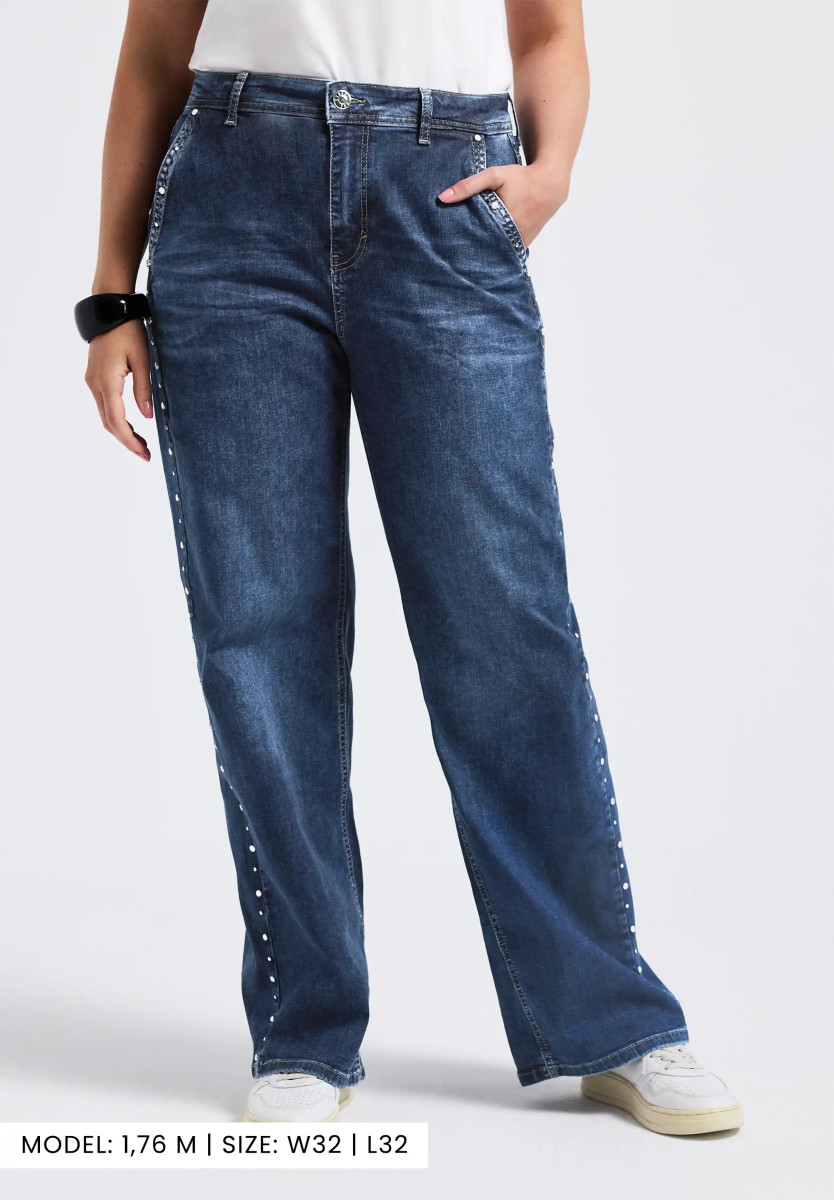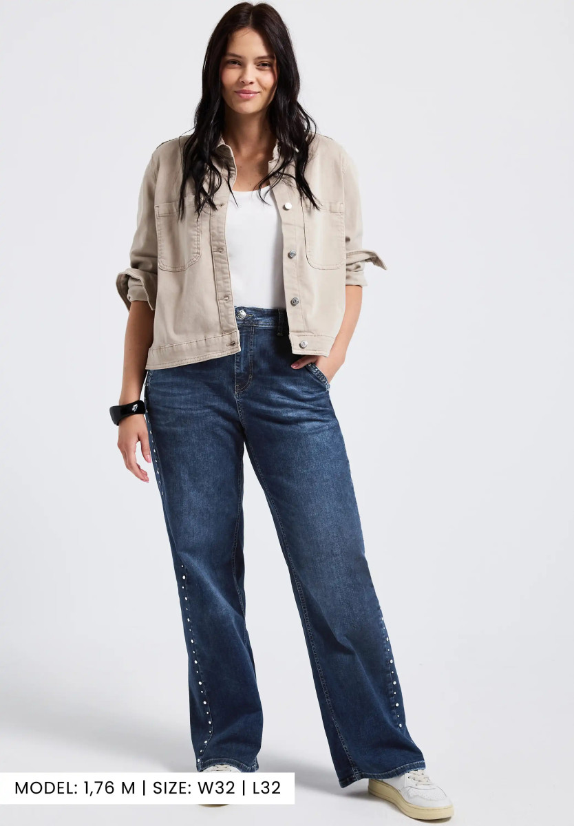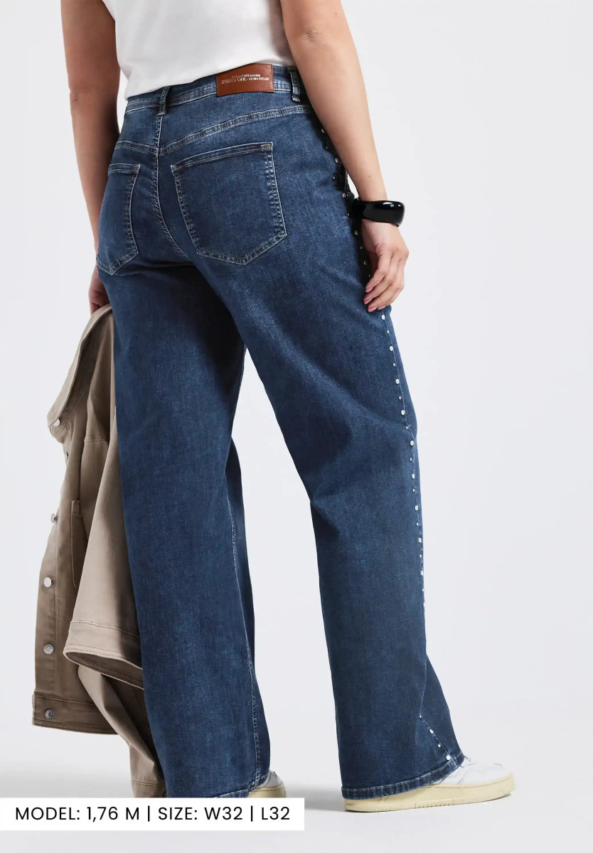 Diese Wide Leg Jeans von Street One punktet mit einem lässigen Loose Fit und einer modernen High Waist-Silhouette. Die weit geschnittenen Beine und die dekorativen Nieten verleihen der Jeans einen trendigen Look. Seitliche Taschen und die blaue Denim-Waschung runden das Design ab, während der angenehme Stoff für hohen Tragekomfort sorgt. Jeanshose im Loose Fit High Waist und Wide Legs Dekorative Nieten Seitliche Taschen Blaue Denim Waschung Material: 82% Baumwolle, 15% Polyester, 3% Elasthan