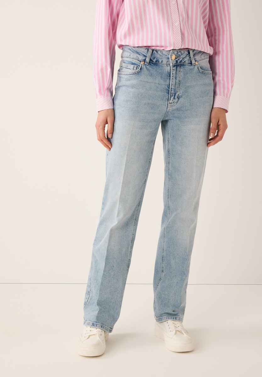 Gerade Form mit weitem Bein | Klassischer 5-Pocket Stil | Mittlere Leibhöhe | Bund mit Gürtelschlaufen | Frontverschluss | Helle Waschung mit angedeuteten Sitzfalten | Sehr bequem dank eines kleinen Stretchanteils