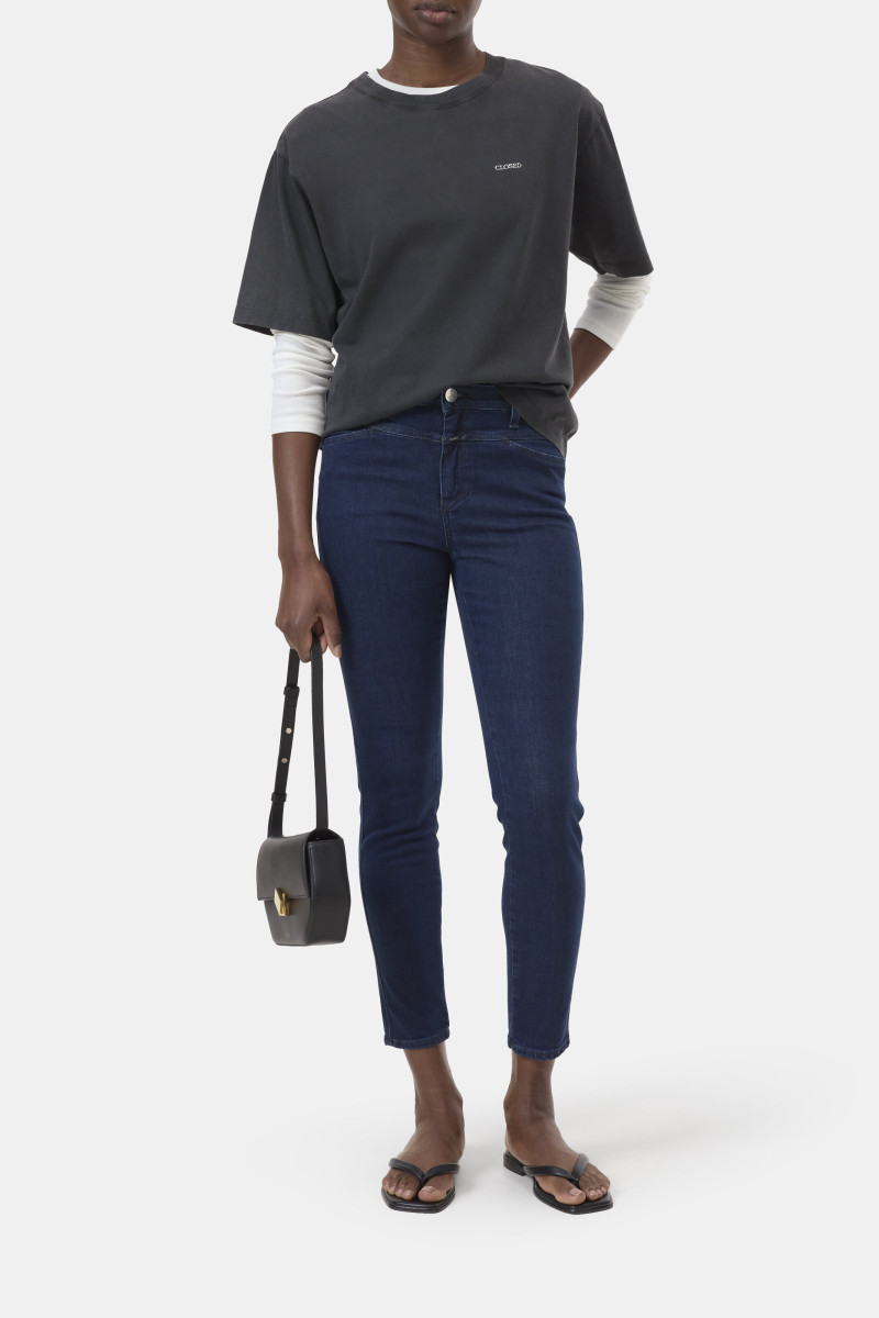 Mittelschwerer Power-Stretch-Denim (11,5 oz.), kompakte Haptik | Blau-schwarze Waschung, dunkle Nähte und X-Pockets | Skinny Fit | High Waist | Cropped Leg | Made in Italy