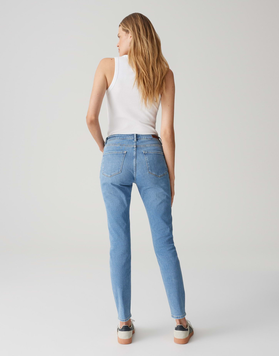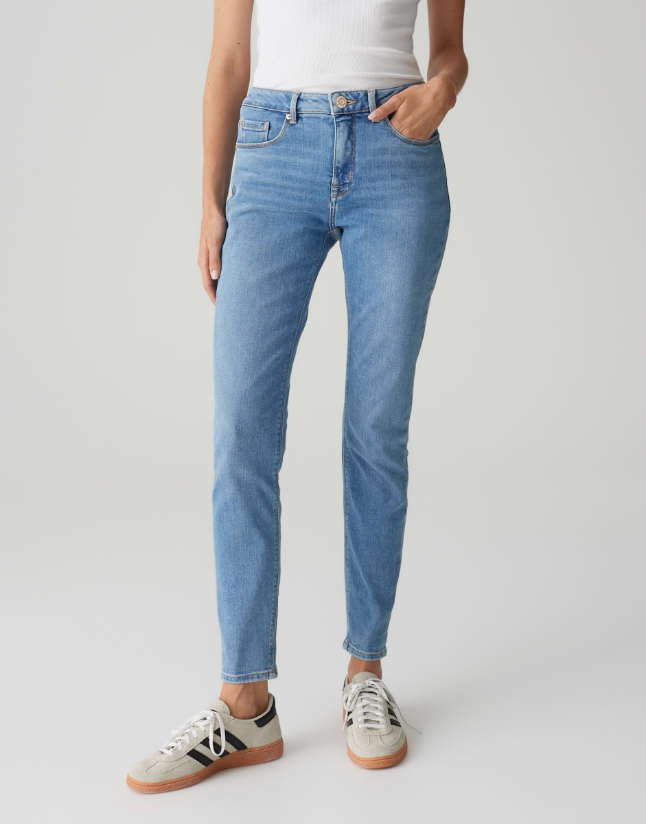 BCI Cotton Mix, helle Waschung, schmales Bein, softer Griff, eckige Gesäßtaschen, 5-Pocket-Design, das Model ist 176 cm groß und trägt Größe 36
