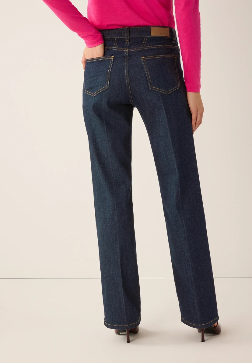 Gerade Form mit weitem Bein und Bügelfalte | Klassischer 5-Pocket Stil | Frontverschluss und Bund mit Gürtelschlaufen | Dunkle, cleane Waschung | Braune Steppnähte | Super bequem dank kleinem Stretchanteil