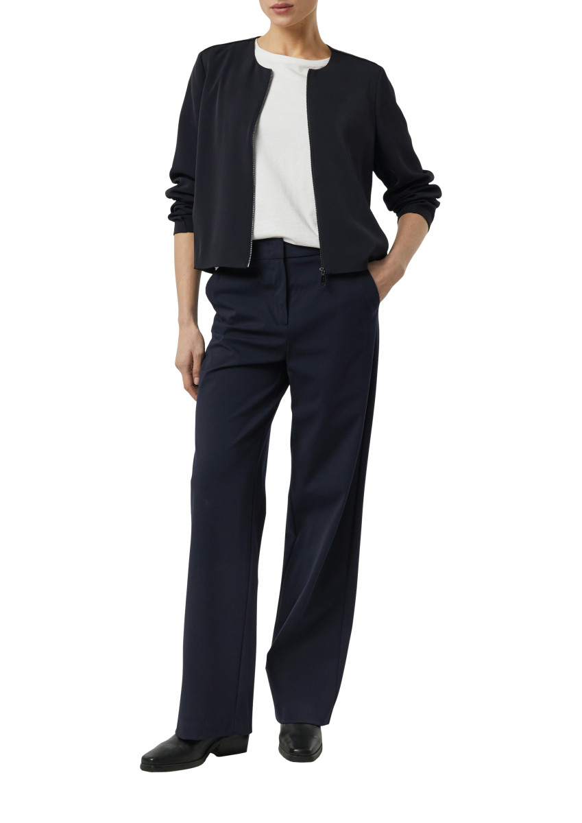 Diese fließende Indoor-Jacke im angesagten Blouson-Stil begeistert mit ihrer lässigen Boxy-Passform und praktischen Eingrifftaschen. Die leichte Travel-Ware mit softem Futter macht sie zum perfekten Begleiter für entspannte Casual-Looks. Der Reißverschluss und die kurze Länge sorgen für eine moderne Silhouette. Kombinieren Sie die Langarm-Jacke vielseitig zu Jeans und Sneakers oder dressen Sie sie mit einer Stoffhose elegant auf – ein echtes Must-have für jeden Tag.