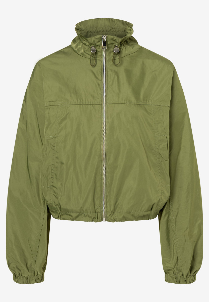 Lässiger Oversized Shape | Stehkragen mit Tunnelzug | Durchgehender Reißverschluss in der vorderen Mitte | Lange, weite Kimonoärmel mit Gummizug am Abschluss | Schräge Eingrifftaschen vorne | Tunnelzug am Saumabschluss | Gefüttert