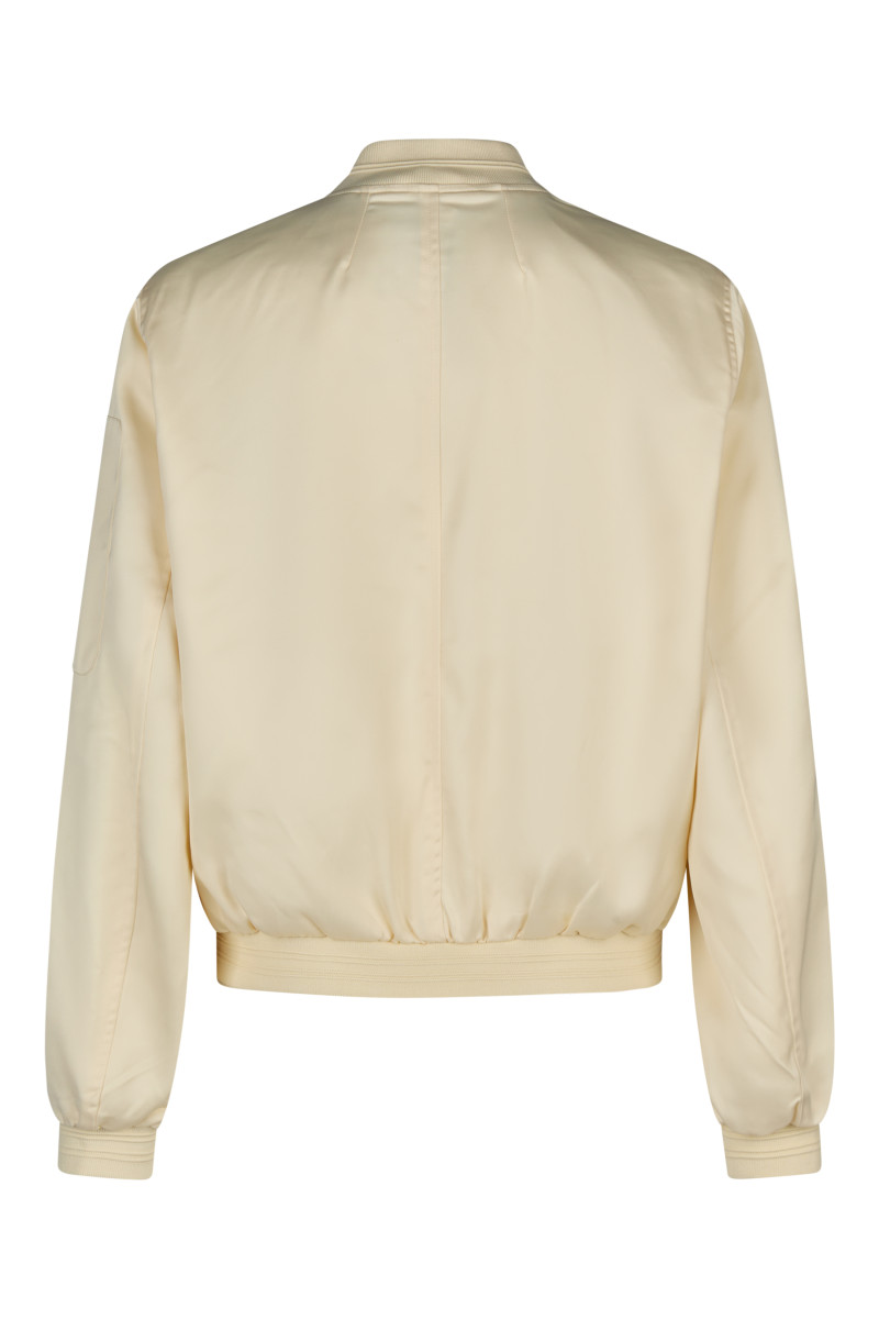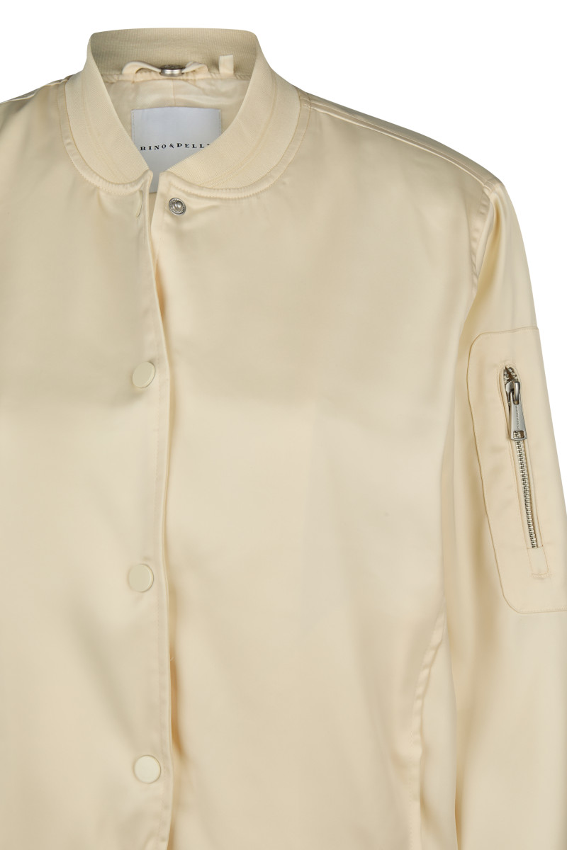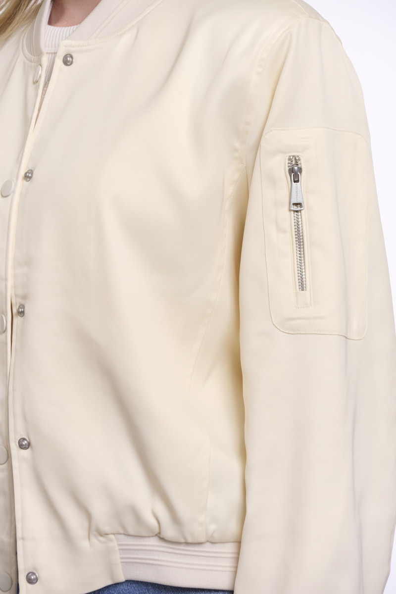 Das Design zeichnet sich durch die klassischen Elemente einer Bomberjacke aus: Rippstrickbündchen an Kragen, Saum und Ärmelabschlüssen und eine sportliche Kurzform. Geschlossen wird die Jacke mit einer Reihe von markanten Druckknöpfen. Funktionale Akzente setzt die kleine Reißverschlusstasche am linken Oberarm. Die Jacke ist ideal für einen lässigen, aber stilvollen Look und kann über einem schlichten Oberteil getragen werden, um das Outfit aufzuwerten.