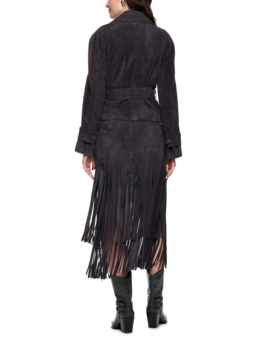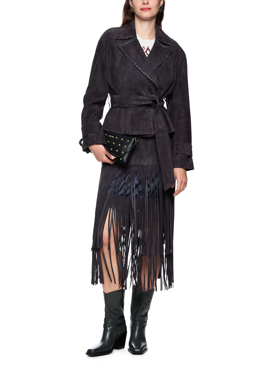 Exklusive Outdoor-Jacke aus feinstem Echtleder mit Gürtel zur Taillenbetonung. Zwei elegante Knöpfe und markante Riegel an den Ärmeln setzen modische Akzente und sorgen für perfekten Sitz. Vielseitig kombinierbar – ideal für elegante wie lässige Outfits.