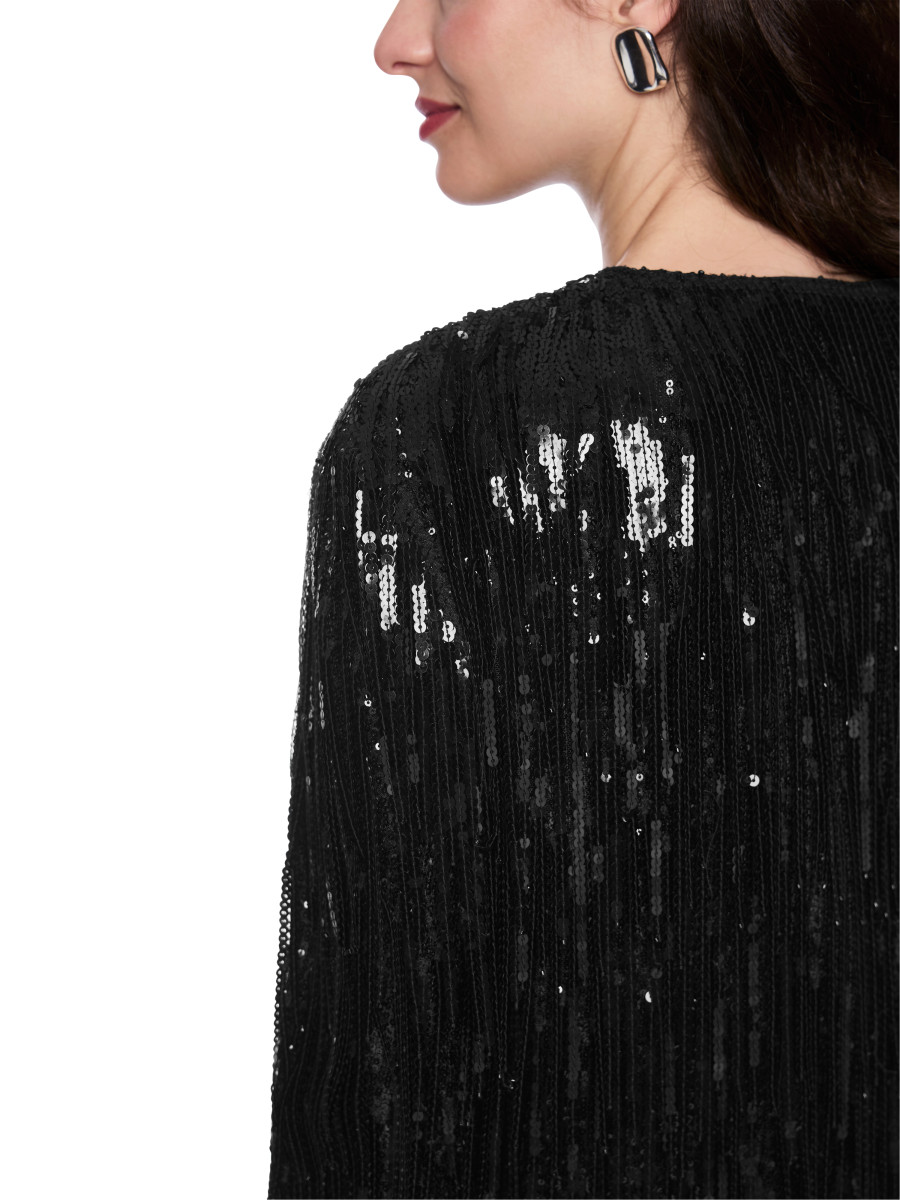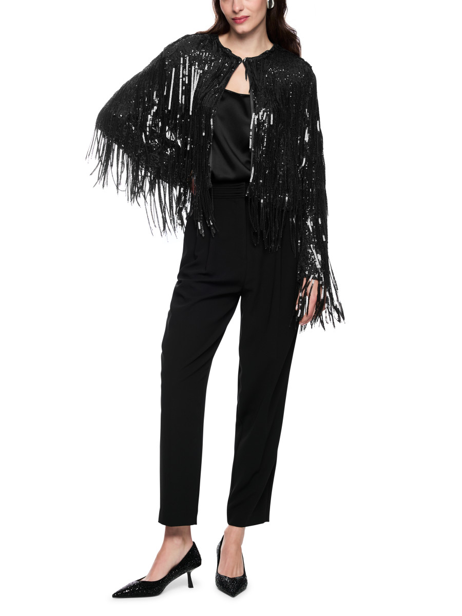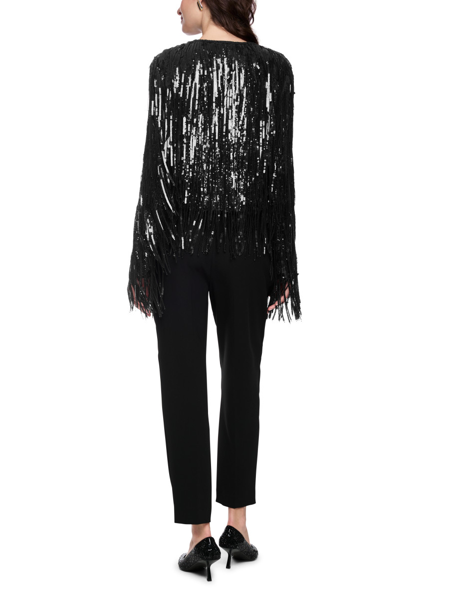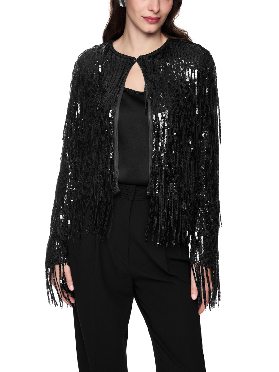 Glamour-Jäckchen mit Pailletten | Ein glamouröses Jäckchen, das mit schwingenden Paillettenfransen bei jeder Bewegung funkelnde Akzente setzt. Der kleine Häkchenverschluss am Ausschnitt sorgt für einen dezenten Halt, ohne den glanzvollen Look zu unterbrechen. Ideal für besondere Anlässe, Partys oder elegante Abendoutfits. Locker geschnitten | Paillettenfransen | Häkchenverschluss | Innenfutter | Das Model ist 179 cm groß und trägt N3/38.