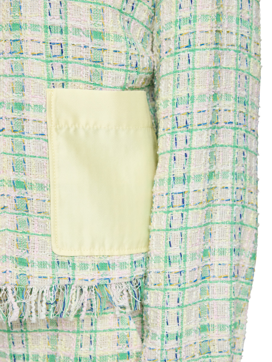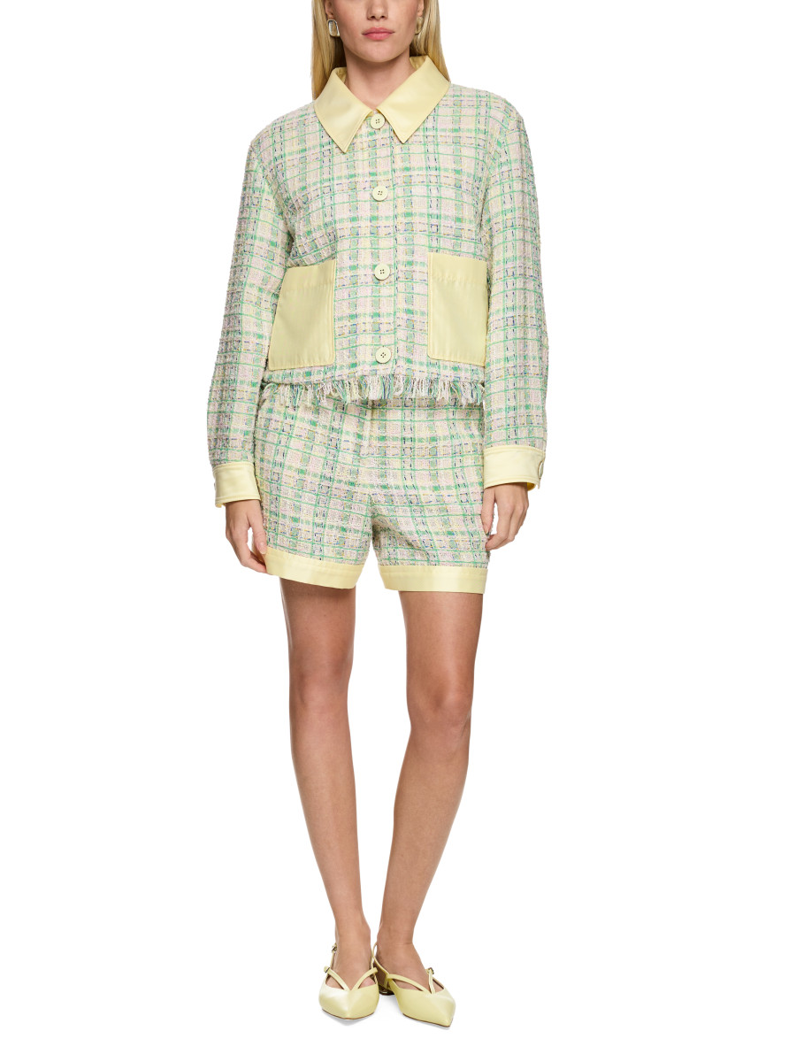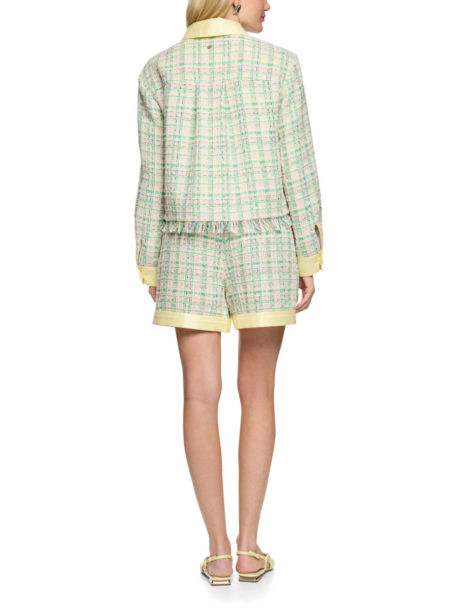 Jacke mit kontrastfarbigen Details | Trendige Jacke mit mehrfarbigem Strukturmuster und unifarbenen Details. Aufgesetzte Taschen, Ärmelmanschetten mit Knopf und Kragen sind unifarben abgesetzt und sorgen für einen modernen Kontrast. Das raffinierte Design macht diese Jacke zum stilvollen Highlight. Leger geschnitten | Fransen am Saum | Aufgesetzte Taschen | Durchgängige Knopfleiste | Das Model ist 179 cm groß und trägt N3/38.
