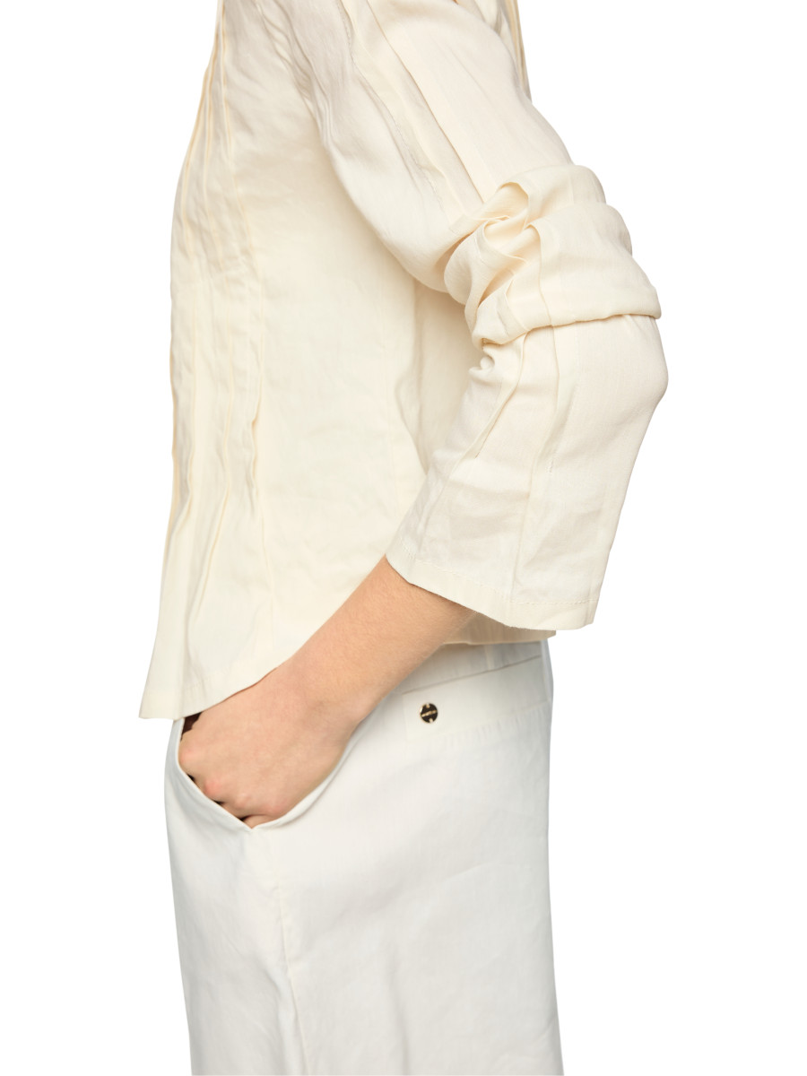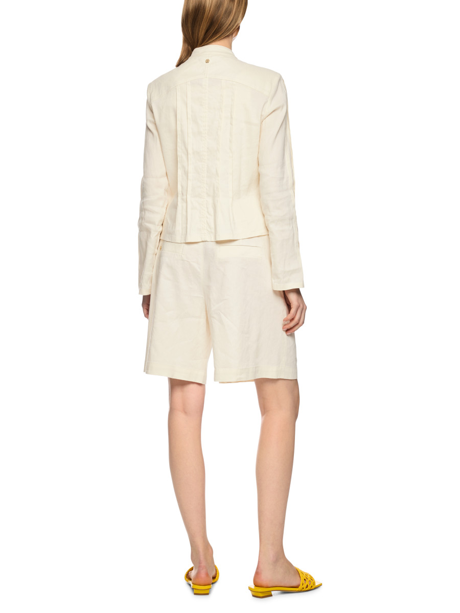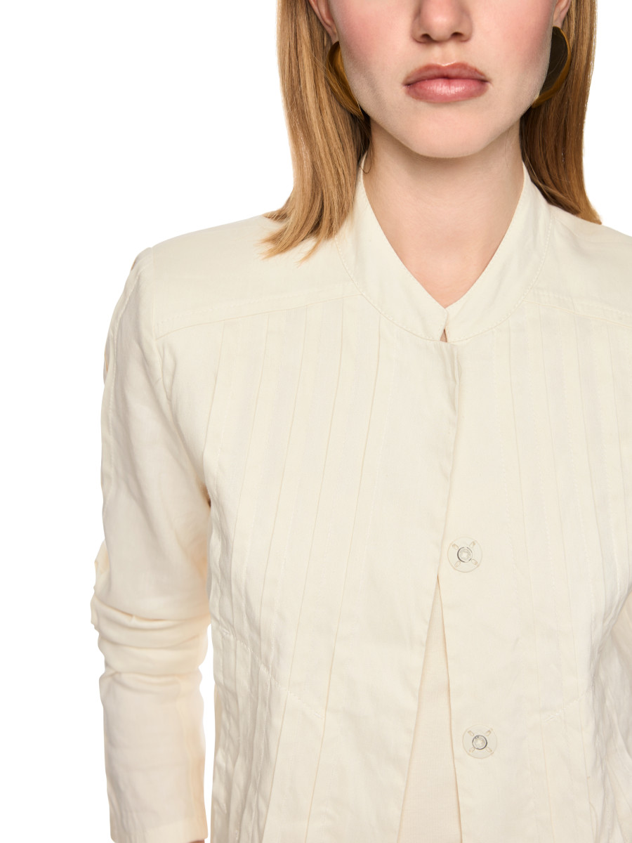 Die feminine Jacke ist aus einem hochwertigen Materialmix aus Leinen, Viskose und Elastan gefertigt und überzeugt durch ihre sorgfältige Verarbeitung. Feine Biesenverzierungen, ein kleiner Stehkragen und ein praktischer Druckknopfverschluss setzen stilvolle Akzente. Schulterpasse und dezente Schulterpolster betonen die leicht taillierte Silhouette für einen modernen, selbstbewussten Auftritt.Lief.-Art-Nr: AC 31.25 W70