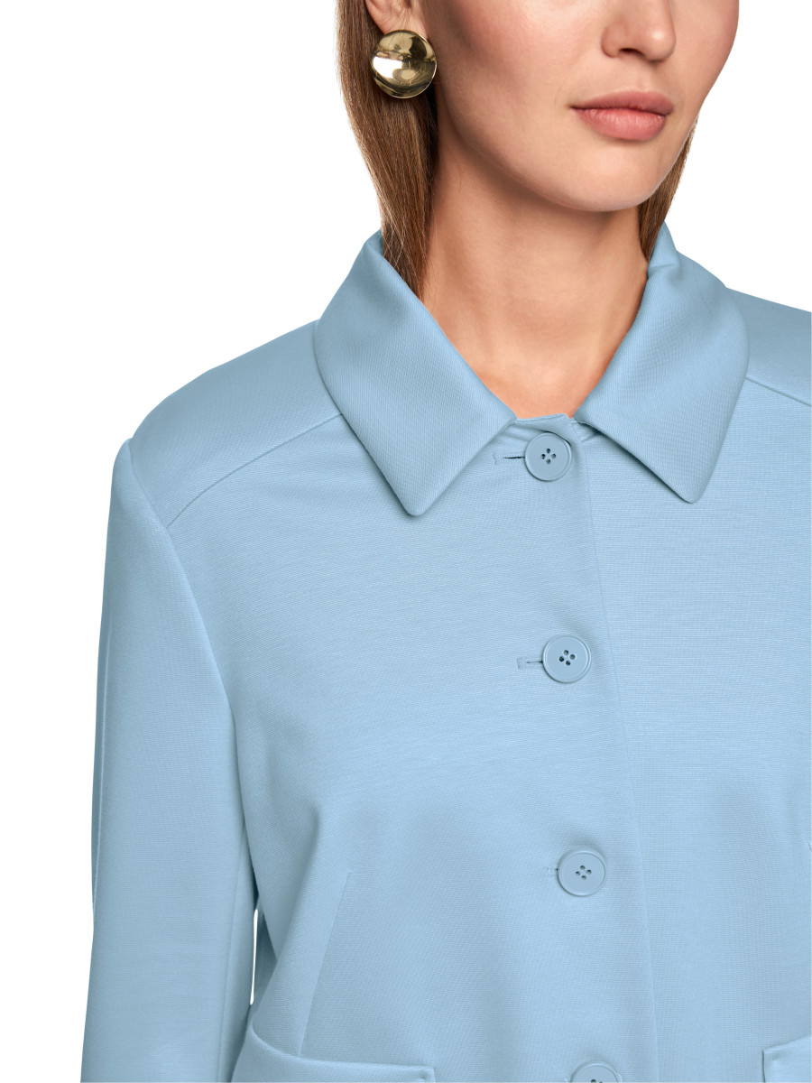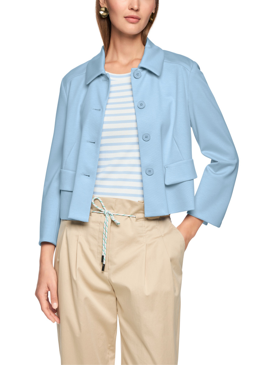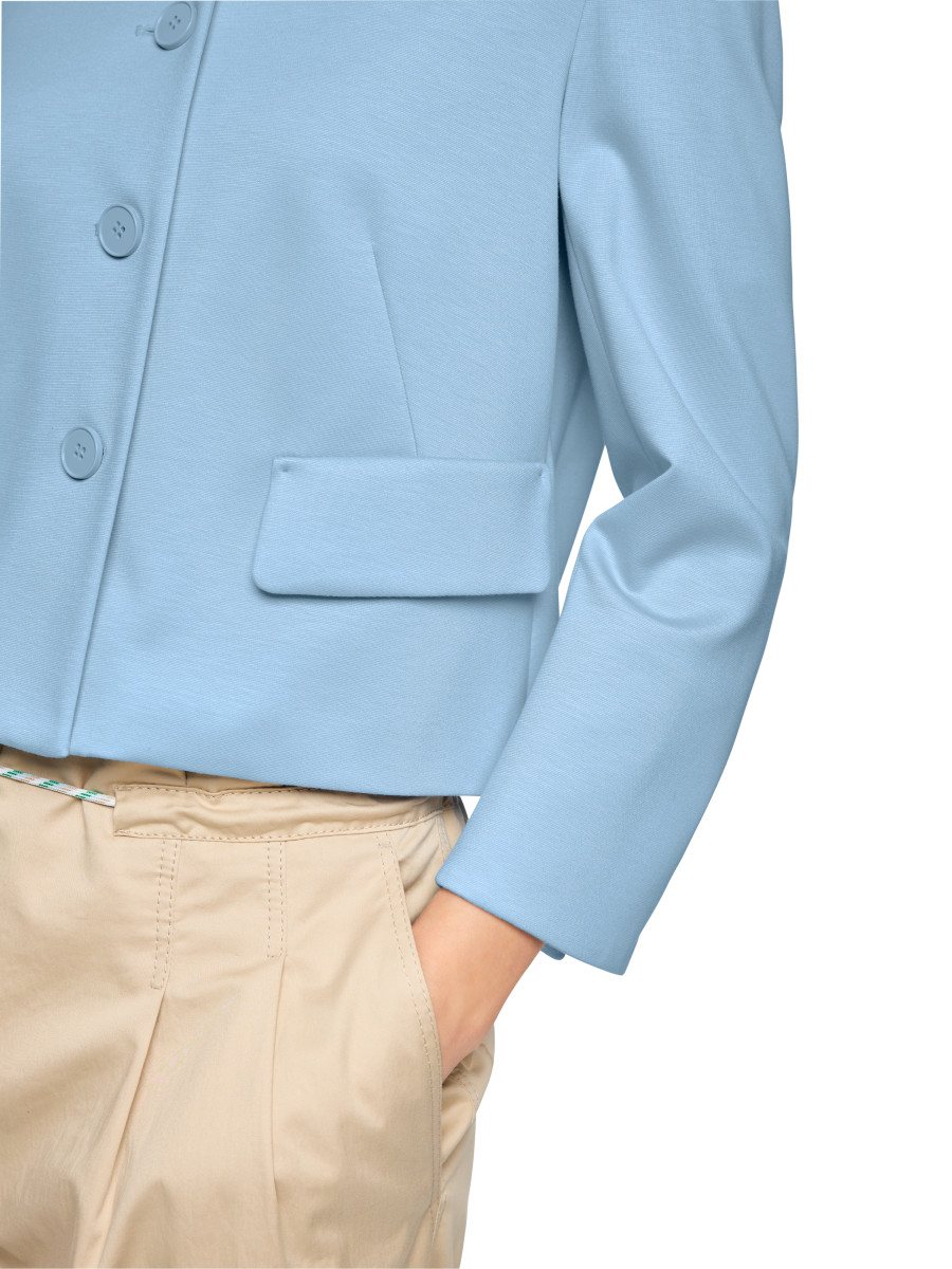 Sixties-inspirierte Jacke. Die Form ist kurz und schmal und die Front ist mit Brustabnähern gearbeitet. Typisch sind der Kentkragen, der Knopfverschluss und die Pattentaschen. Das Modell ist aus einem viskose-basierten Fasermix mit geringem Elasthan-Anteil - und ungefüttert. Wirkt toll zu weichfließenden Kleidern und Bottoms.