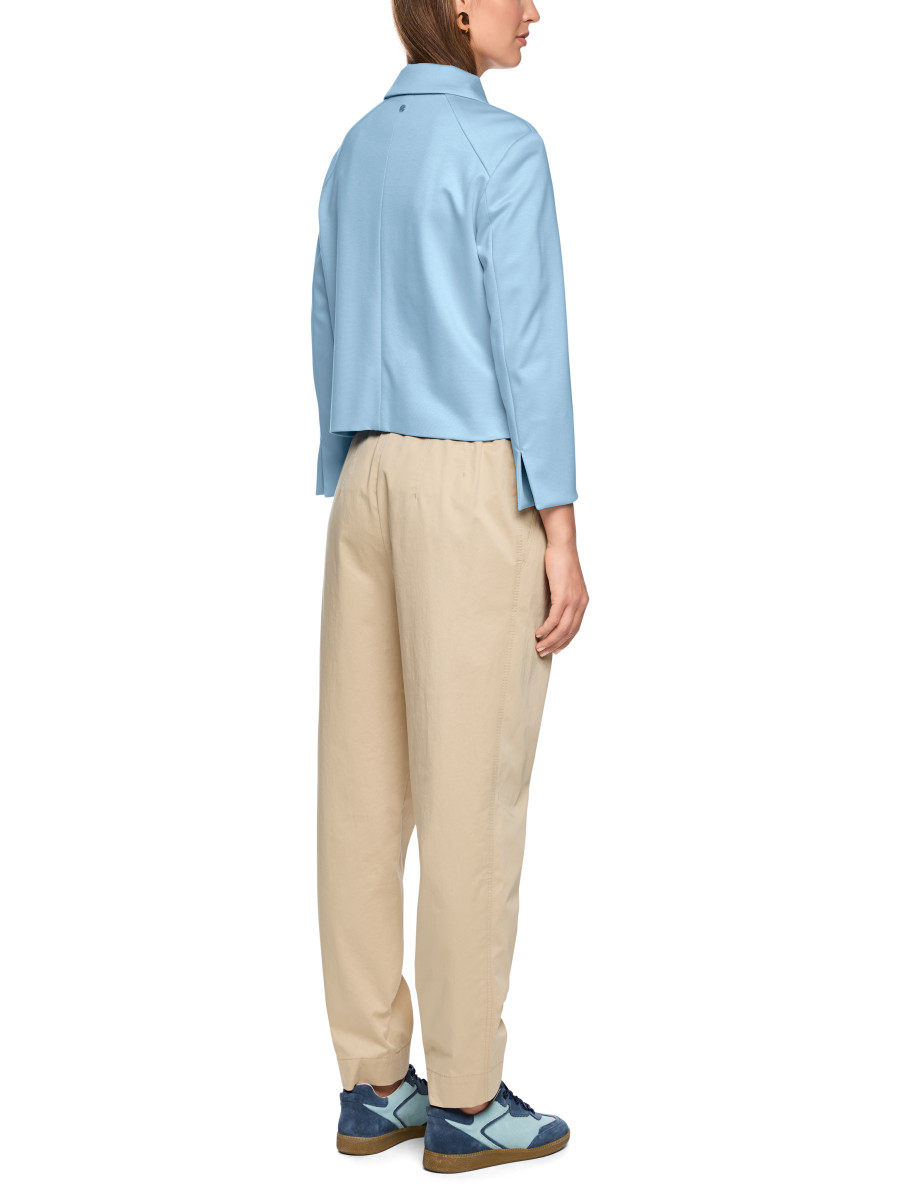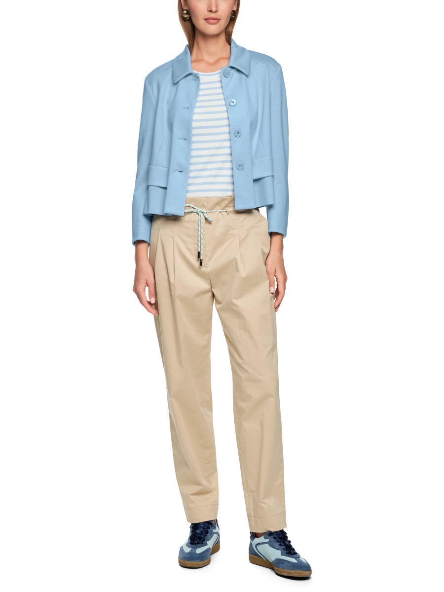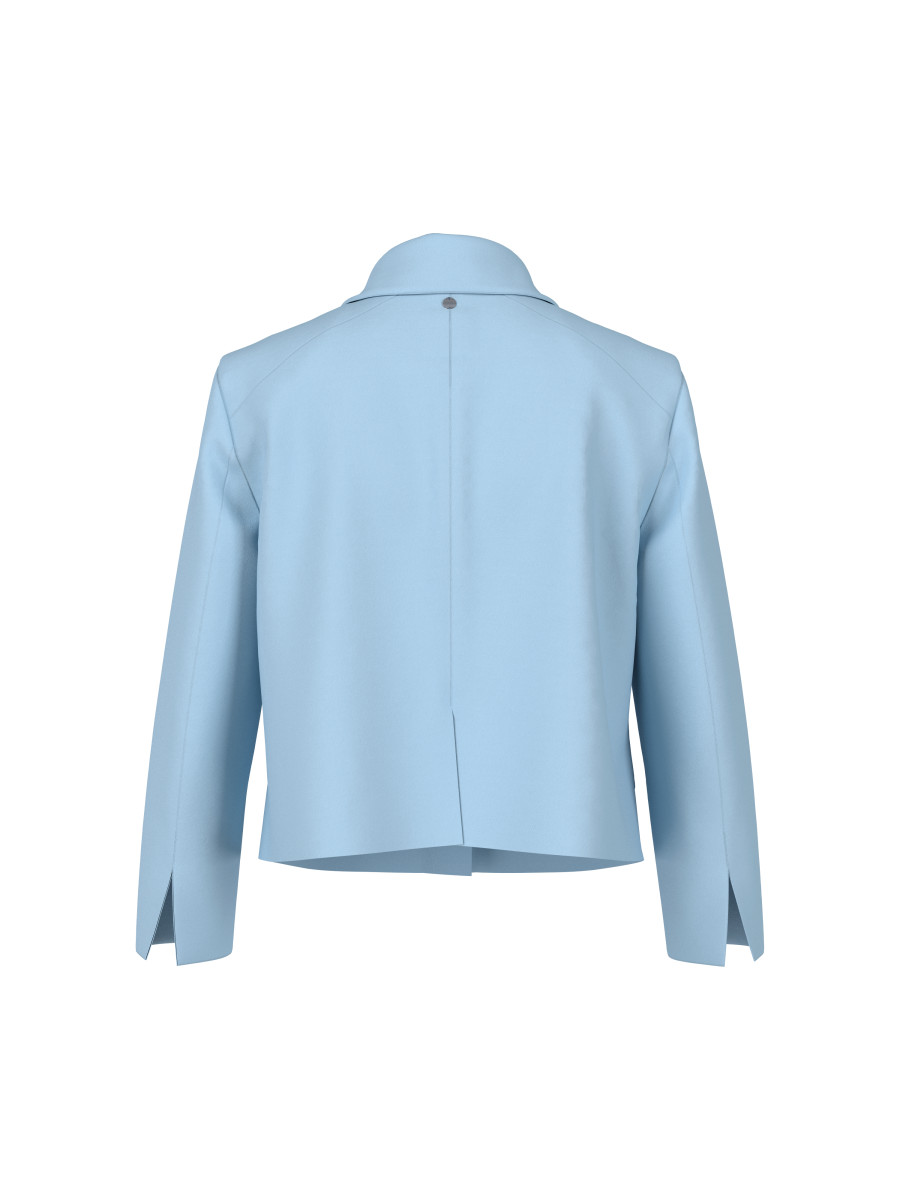 Sixties-inspirierte Jacke. Die Form ist kurz und schmal und die Front ist mit Brustabnähern gearbeitet. Typisch sind der Kentkragen, der Knopfverschluss und die Pattentaschen. Das Modell ist aus einem viskose-basierten Fasermix mit geringem Elasthan-Anteil - und ungefüttert. Wirkt toll zu weichfließenden Kleidern und Bottoms.