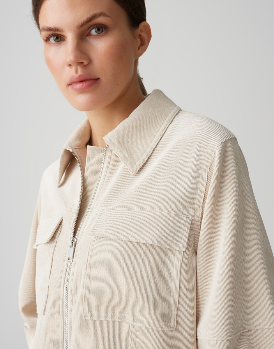 Diese Jacke aus feinem Cord überzeugt durch ihre lässige Eleganz und den femininen Ballonärmel. Der gerade Schnitt in lockerer Passform und die verkürzte Rückenlänge sorgen für einen modernen, entspannten Look. Der 3/4-Arm in Kombination mit dem Umlegekragen und der markanten Reißverschluss-Front verleiht der Jacke einen lässigen Utility-Charakter. Die feine Rippstruktur des soften Cords unterstreicht den weich fließenden Fall und sorgt für ein angenehmes Tragegefühl. Raffinierte Details wie aufgesetzte Pattentaschen, eine Rückenpasse mit Quetschfalte und abgesteppten Teilungsnähten machen dieses Piece zu einem stilvollen Allrounder.