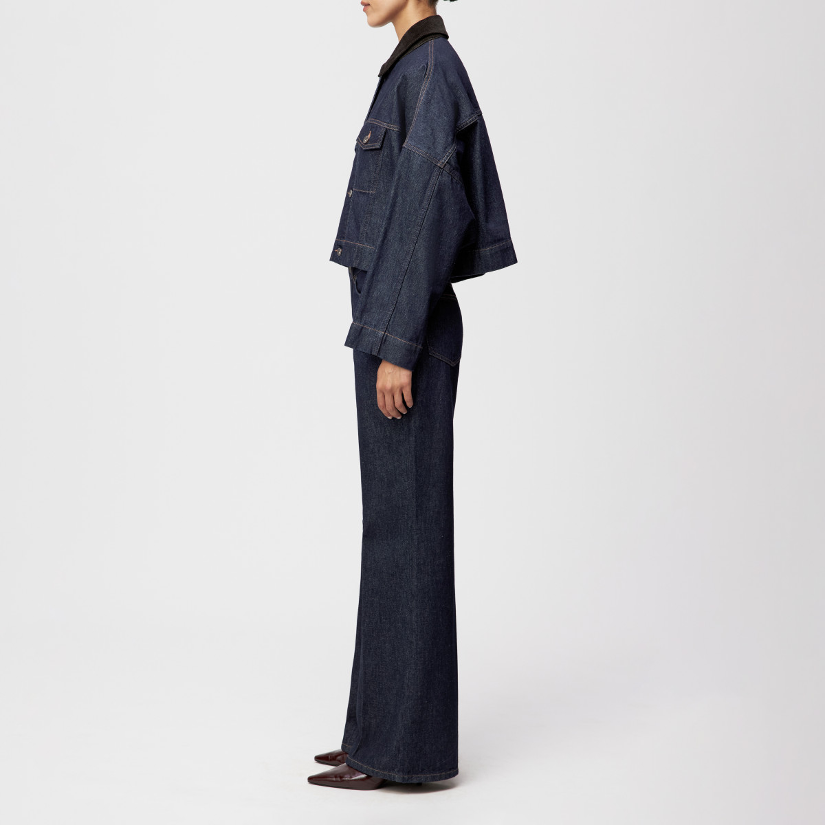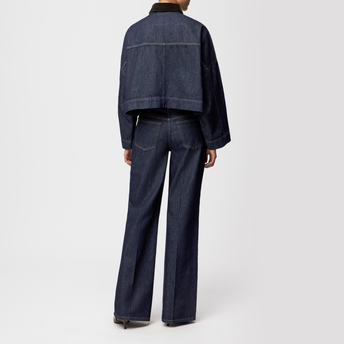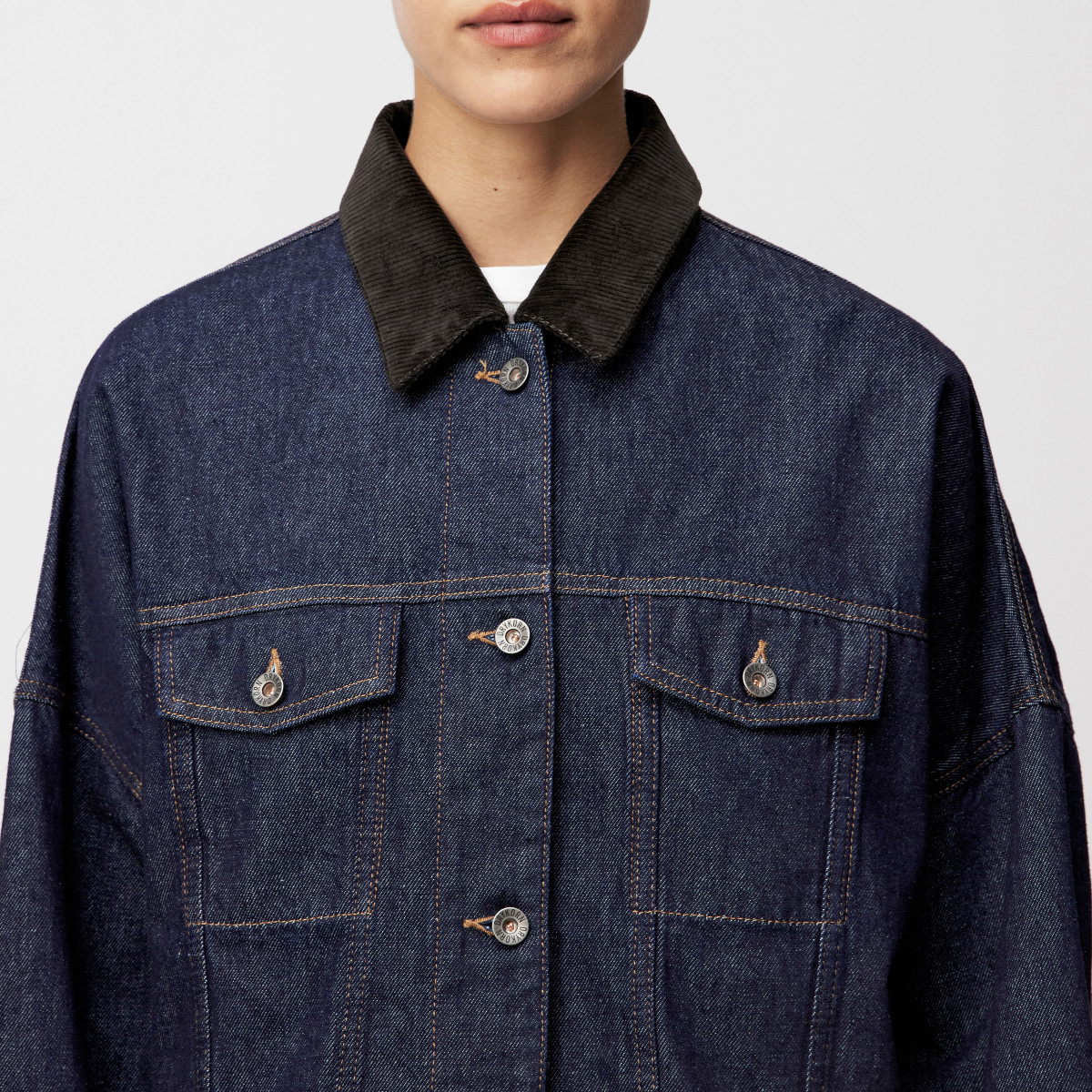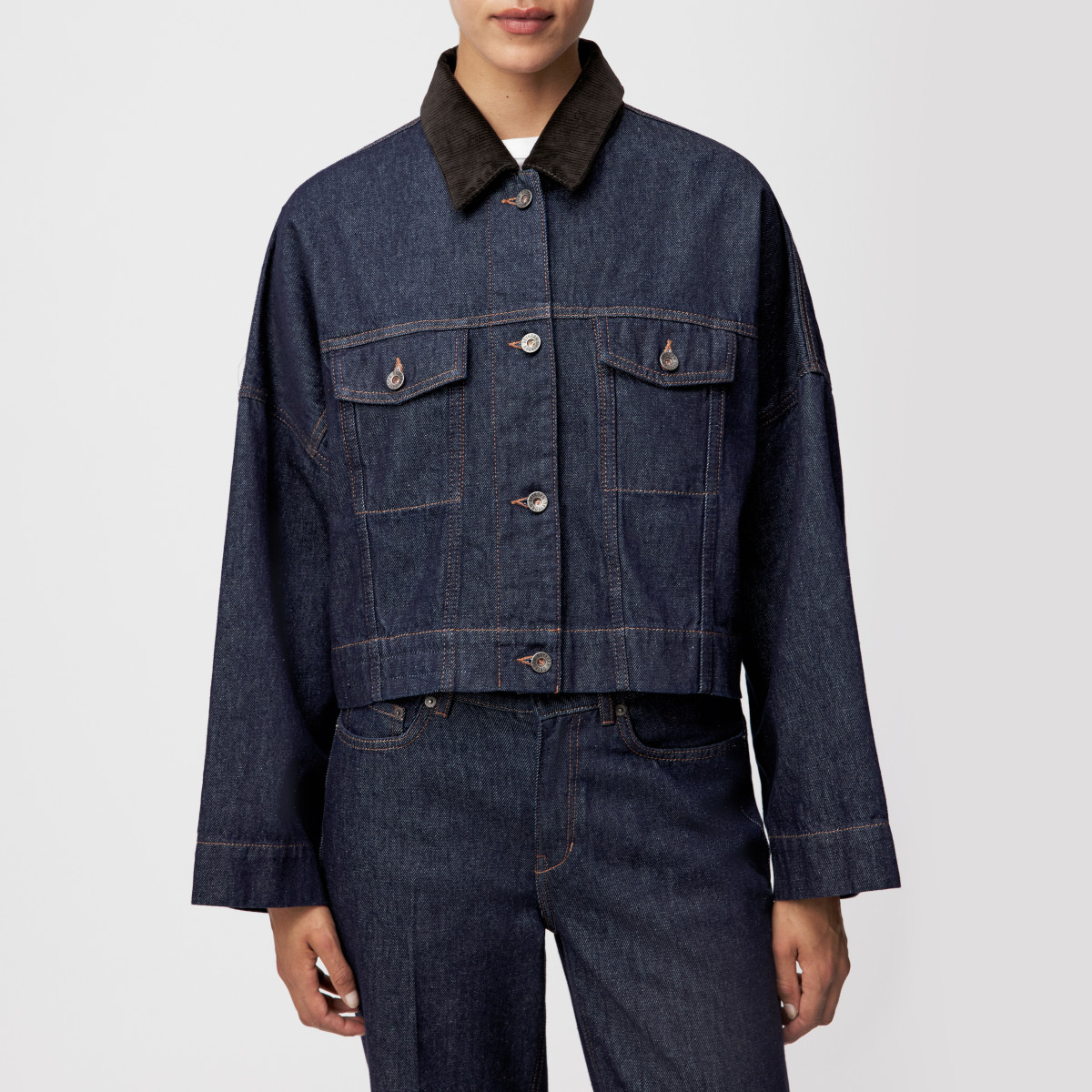 Diese moderne Cropped Jeansjacke interpretiert den Klassiker neu: Aus robustem, tiefblauem Denim gefertigt, überzeugt sie mit klaren Linien und einem markanten Kontrastkragen aus Cord. Der breite, strukturierte Kragen in Dunkelbraun verleiht der Jacke eine vintage-inspirierte Note und setzt einen stilvollen Akzent zum ansonsten minimalistischen Design.