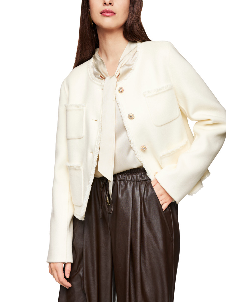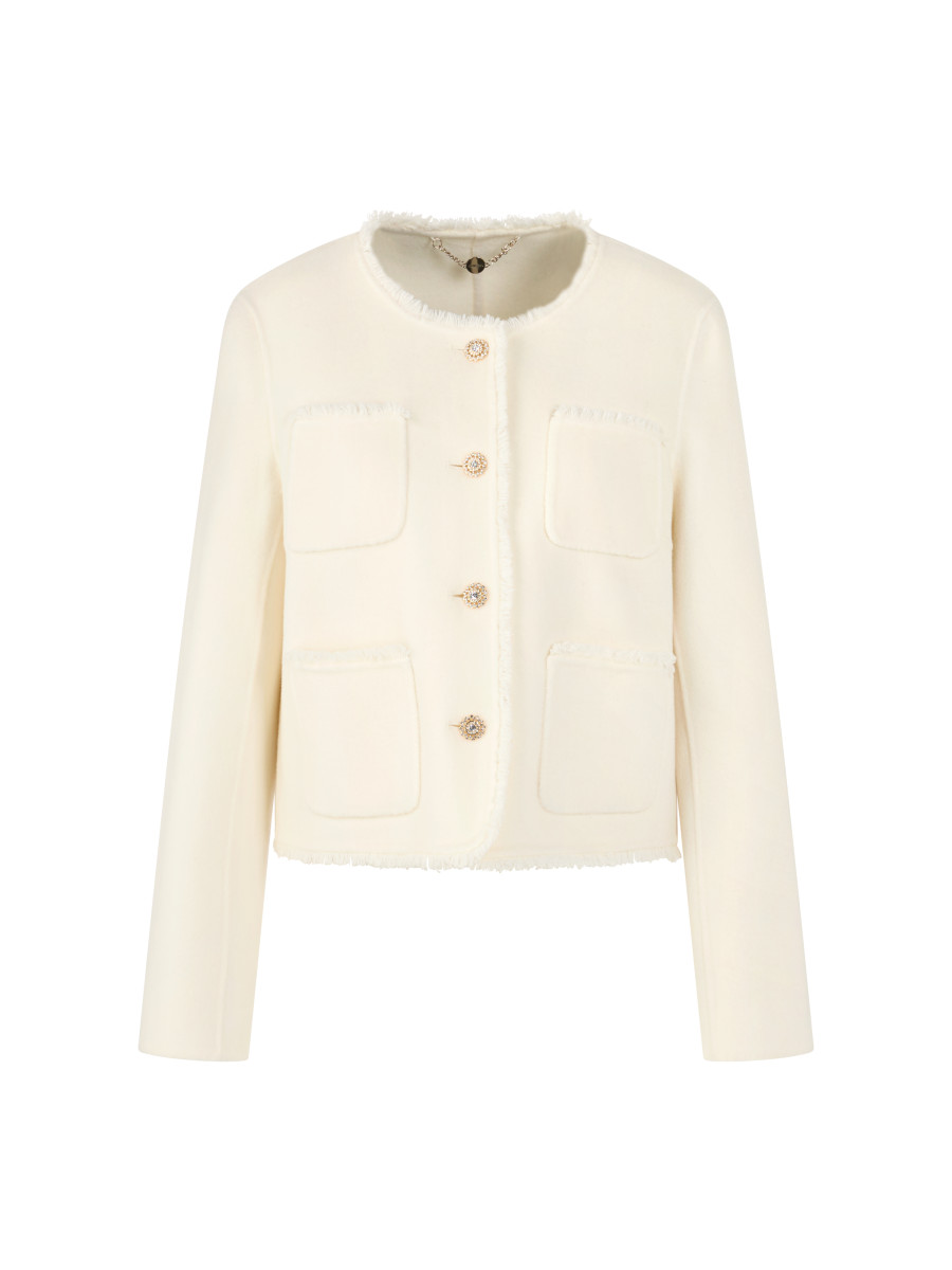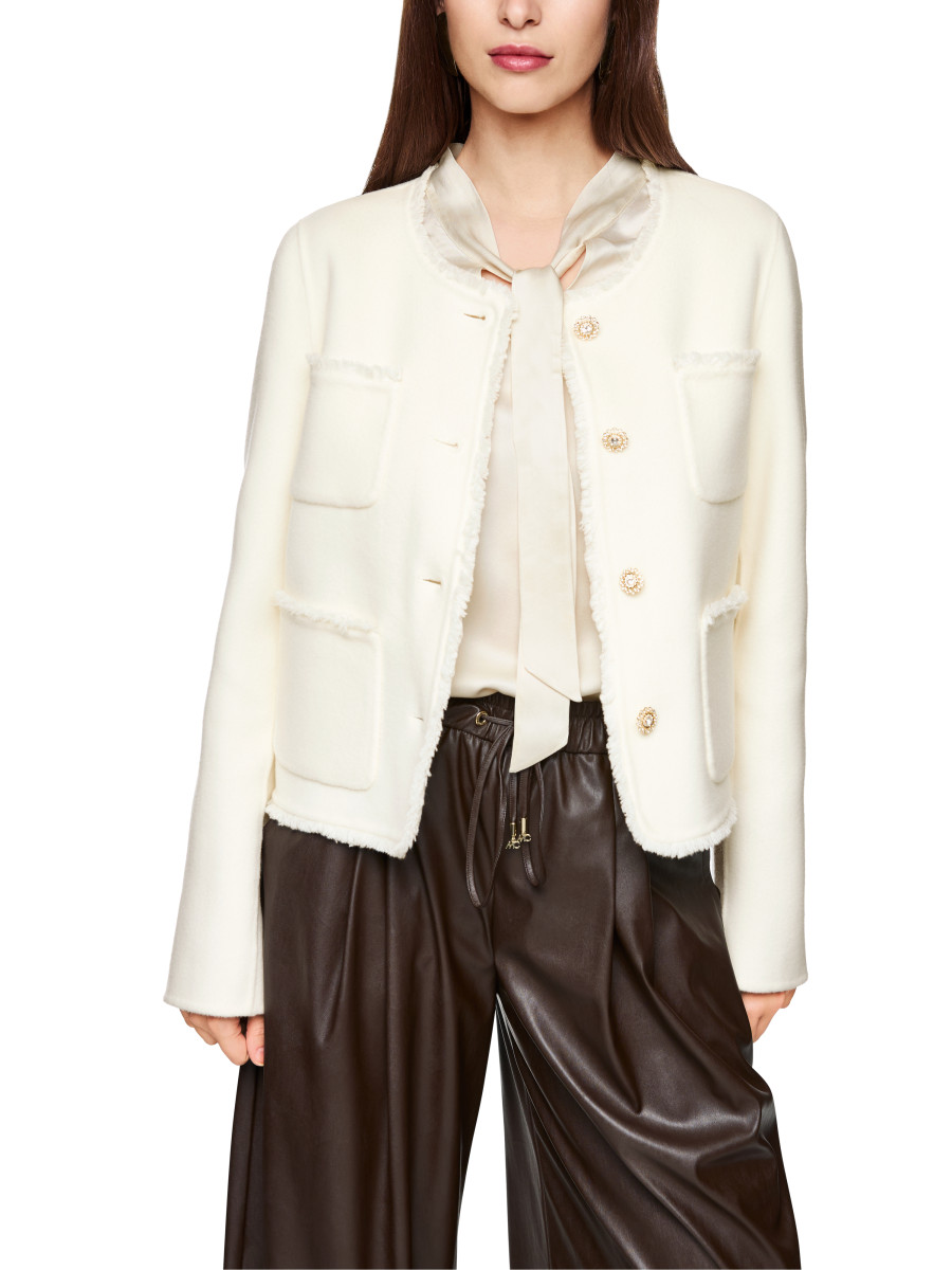 Jacke mit aufgesetzten Taschen|Die Jacke hat eine kurze Passform und einen Rundhals. Vier aufgesetzte, offene Vordertaschen und ein Knopfverschluss mit Zierknöpfen an der Vorderseite runden das Modell ab. Kurze Passform | Aufgesetzte Taschen | Ärmelschlitz | Schmuckknöpfe | Das Model ist 179 cm groß und trägt N3/38.