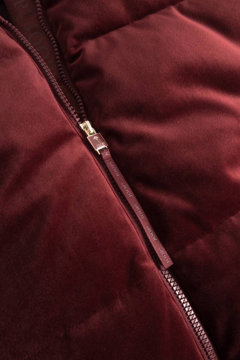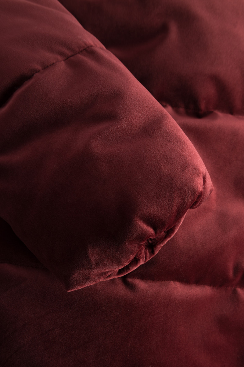 Diese modische Steppjacke besticht durch ihr samtiges, weiches Material in einem tiefen Rotton. Die Jacke hat eine lockere Passform und einen hohen Stehkragen, der besonders warm hält. Die großzügige Steppung sorgt für ein stylishes Design und zugleich für angenehme Wärme.