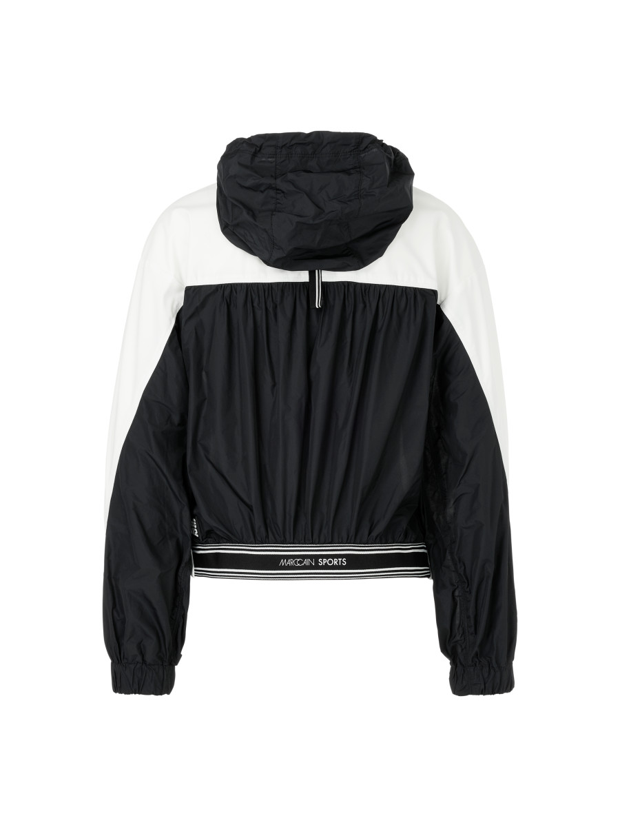 Sportive Jacke mit Kapuze und Zipp | Jacke in leichtem, stretchigem Gewebe. Das Modell ist mäßig weit und tendenziell sportlich. Im Kontrast dazu: Rüschensaum an den Taschen und ein am Sattel gekräuseltes Rückenteil. Die Weite des Rückensaums ist mit einem Gummibund reduziert. Cool, die Farbteilung: Das Vorderteil ist weiß, Kapuze und Teile des Rückens und Ärmels sind schwarz. Der Stoff ist aus recyceltem Polyamid. Mäßig weit | Blouson-Form | 2-Wege-Zipp | Gummizug im Ärmelsaum | Das Model ist 179 cm groß und trägt N3/38.